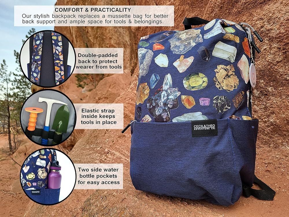 • Spacious Backpack: The polyester backpack of our rock pick set is covered with vibrant crystal and mineral prints on the outside. The backpack is spacious enough to carry a packed lunch and a change of clothes along with the gold prospecting equipment.