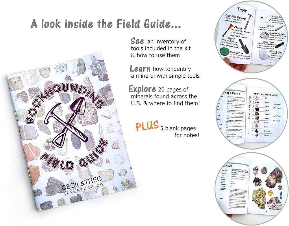 • Field Guide Booklet: Our geology kit comes with a 32-page rockhounding field guide. The field guide for beginners includes a safety page, a brief description of the tools, a description to identify minerals, a geographical index of minerals found in the US, and 5 pages for taking notes in the field.