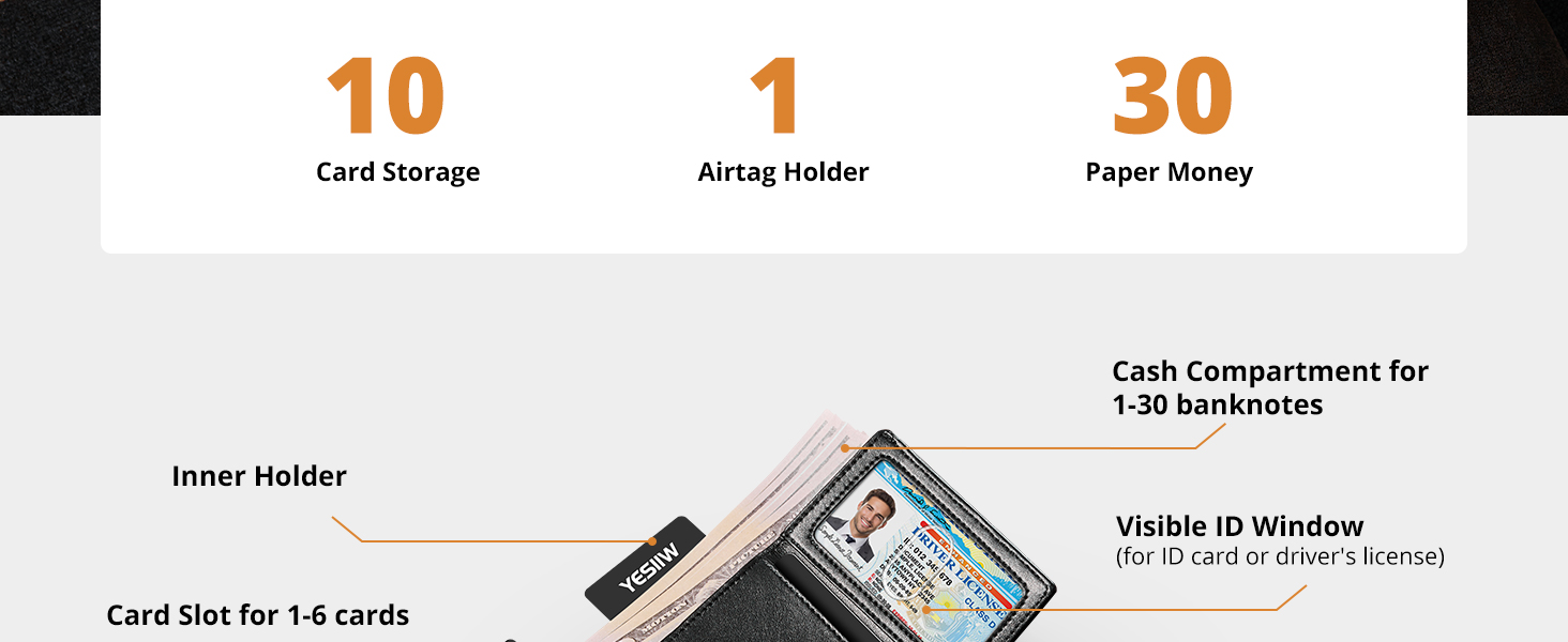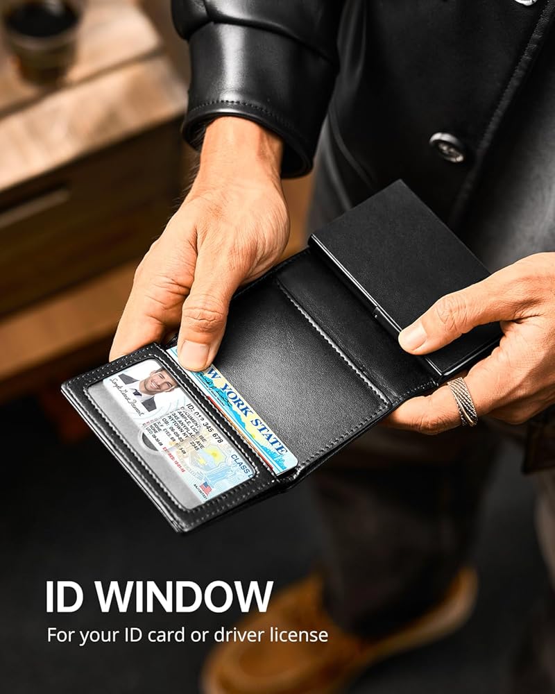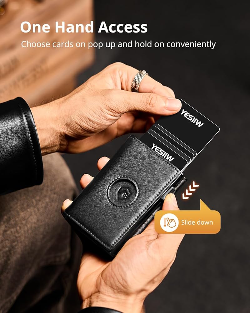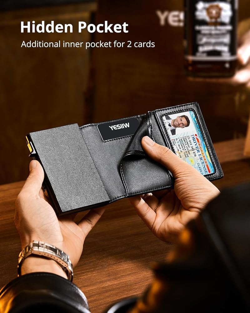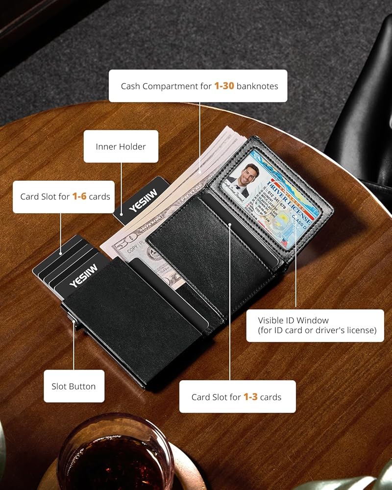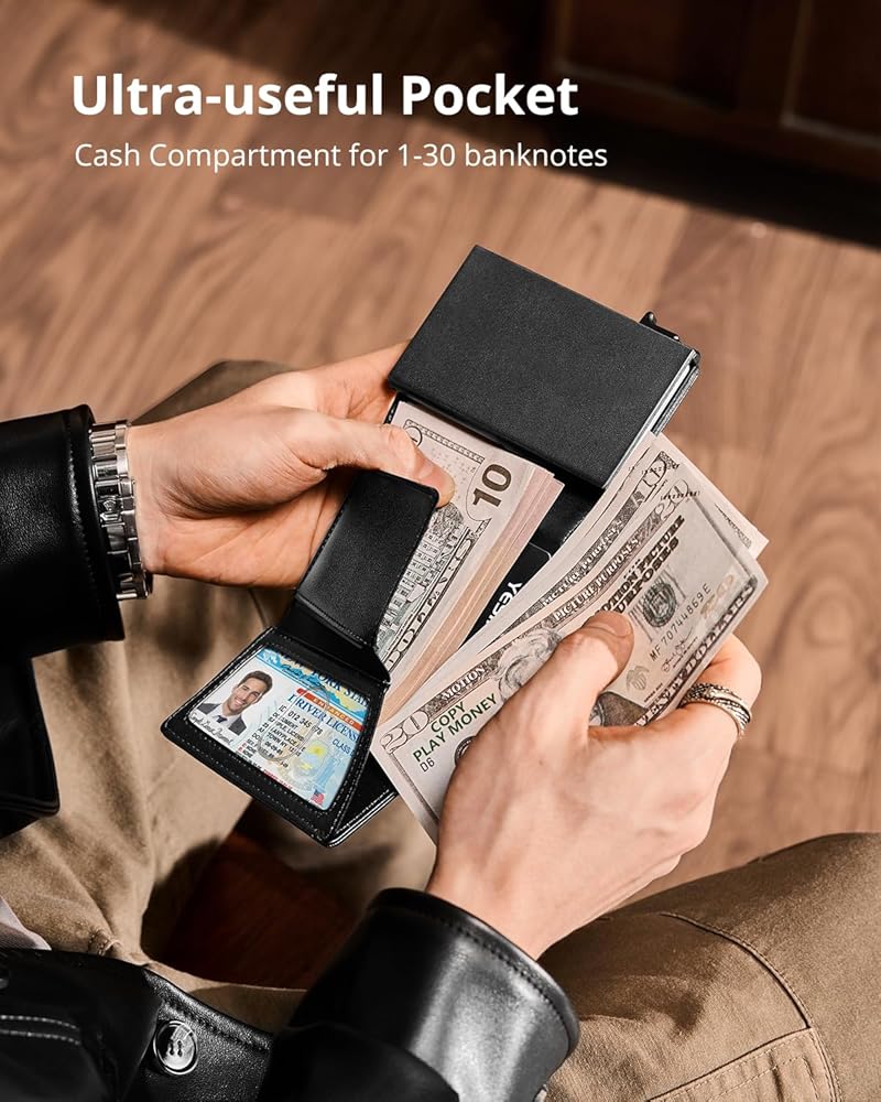 💳وصول سهل وسعة كبيرة: يمكن لمحفظة الرجال الوصول إلى بطاقاتك بسهولة من خلال تمرير سلس للزر. تضمن آليتنا المنبثقة المبتكرة استرجاع البطاقات بسرعة، بينما تستوعب المقصورات المتعددة ما يصل إلى 10 بطاقات، و30 حامل أموال، وحامل بطاقة هوية واحد.