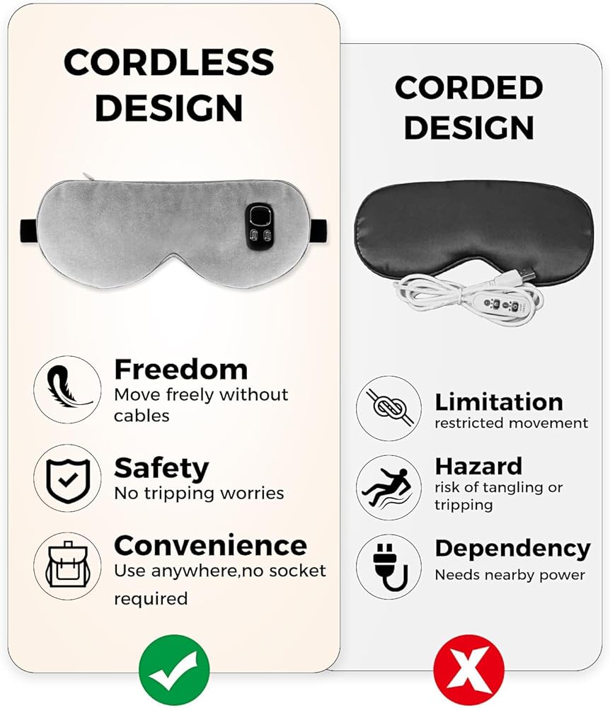• 【تصميم لاسلكي】 يتميز قناع العين الساخن بتصميم لاسلكي، مما يجعله سهل الاستخدام ومريح للحمل. يمكنك ارتداؤه في أي مكان وفي أي وقت دون أن تكون مقيدًا بالأسلاك أو المقابس.