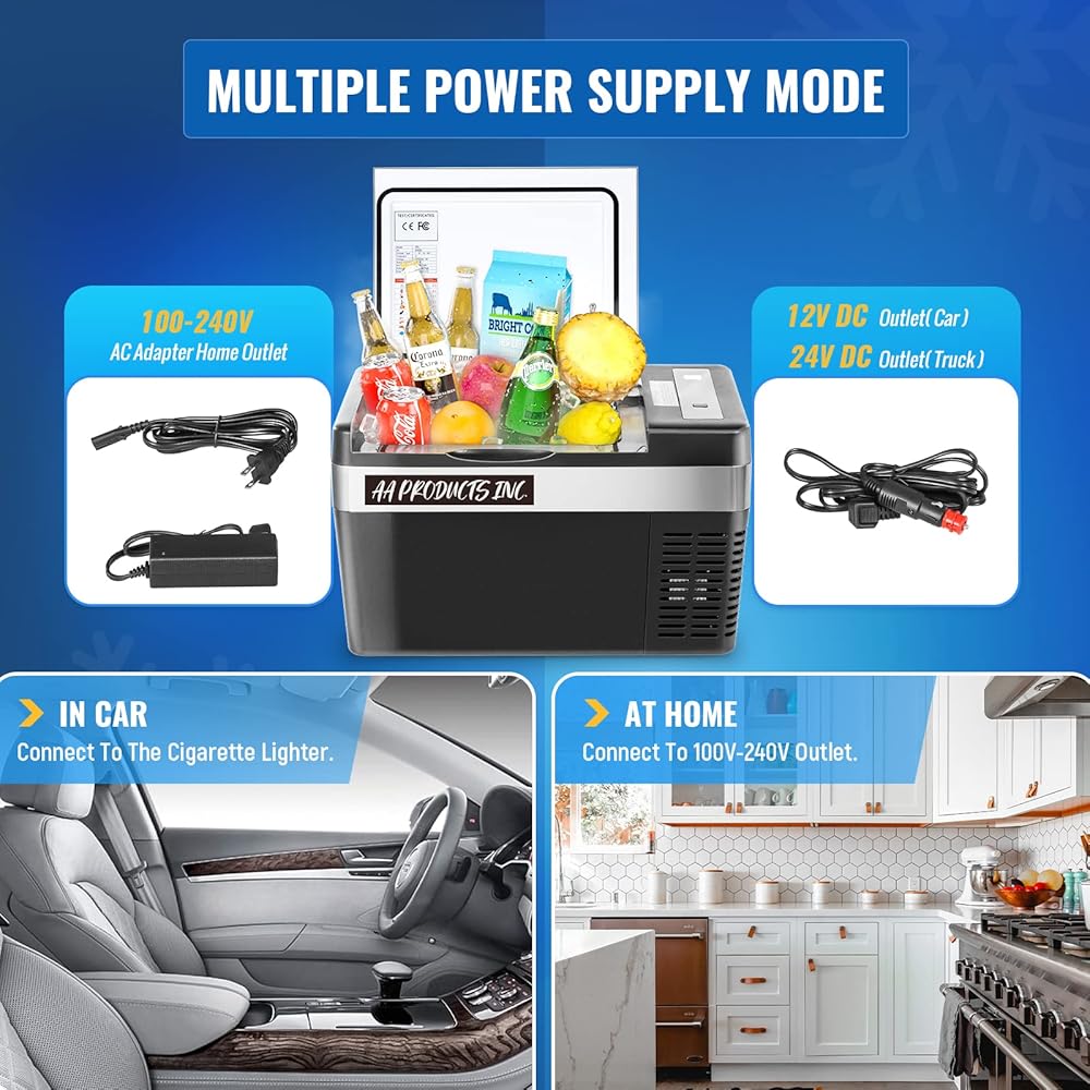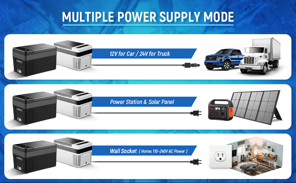 حل متعدد الطاقة: يمكن تشغيل الفريزر المحمول من المنزل والطاقة الشمسية باستخدام محول تيار متردد، ومباشرة بواسطة تيار مستمر 12 فولت/24 فولت. أثناء التشغيل، يبلغ صوت الثلاجة 12 فولت حوالي 45 ديسيبل، مما لن يؤثر على قيادتك وراحتك.