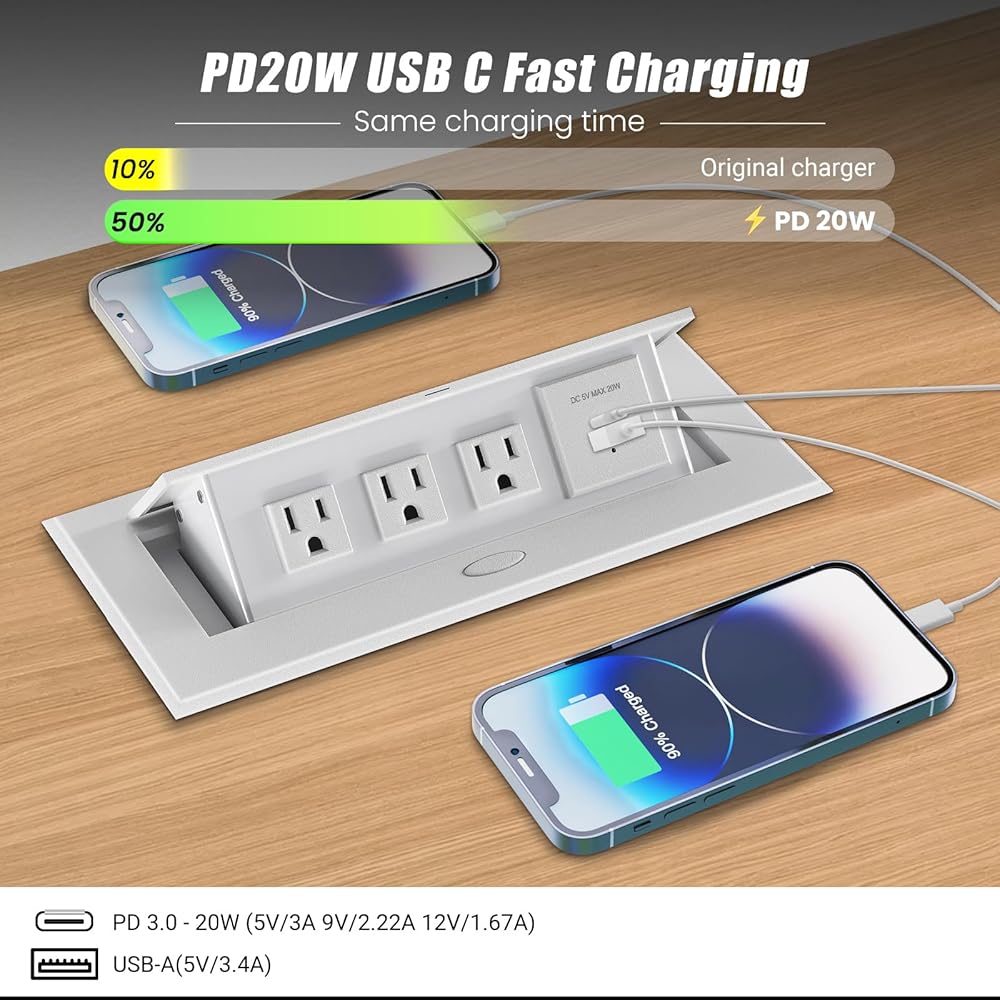 【شحن سريع PD 20W USB C】تم تجهيز منفذ الطاقة المنبثق لطاولة المؤتمرات بتقنية شحن ذكية، لتوفر لك كفاءة شحن أسرع بنسبة 50% من الشاحن الأصلي. مخرج USB-A 5 فولت 3.1 أمبير، مخرج USB-C 5 فولت/3 أمبير، 9 فولت/2.22 أمبير، 12 فولت/1.67 أمبير، بحد أقصى 20 وات.