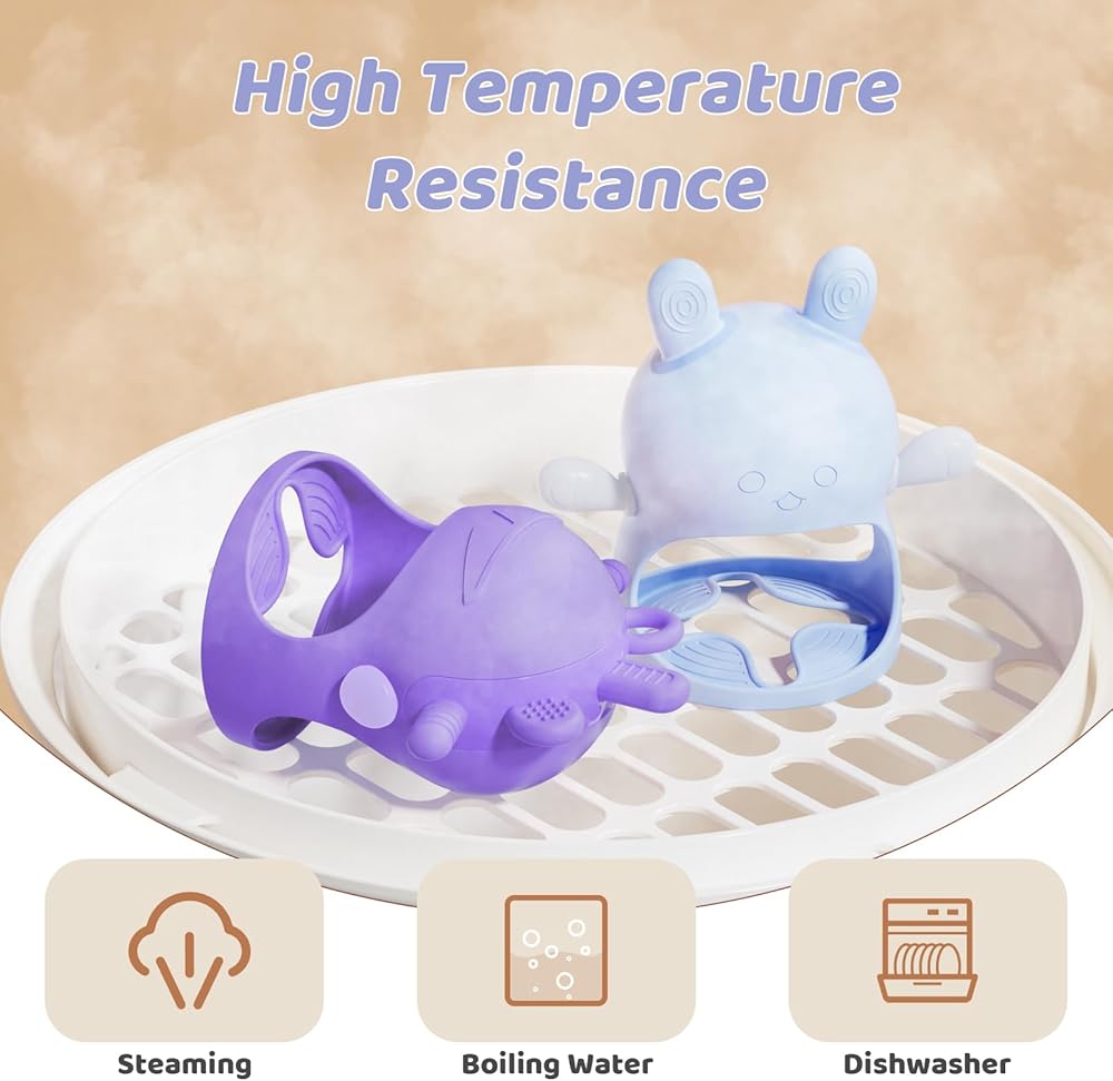 • 💜تخفيف التسنين: النتوءات المتعددة والأنسجة الغنية على الحواف تجلب المزيد من الاهتمام للأطفال. مادة السيليكون الناعمة والمرنة يمكن أن تخفف آلام التسنين بلطف، ولن تؤذي لثة الطفل الملتهبة.