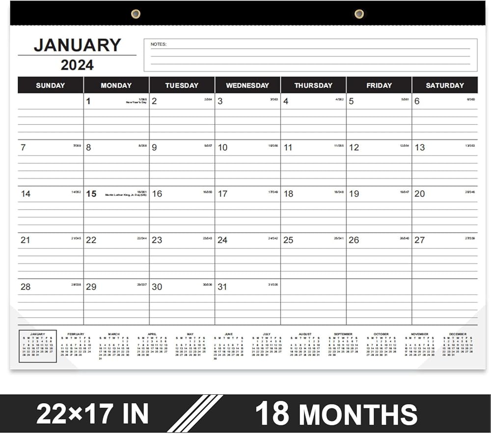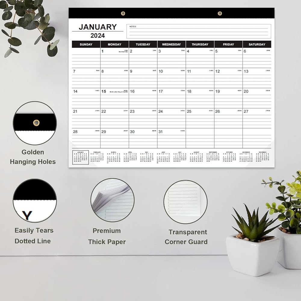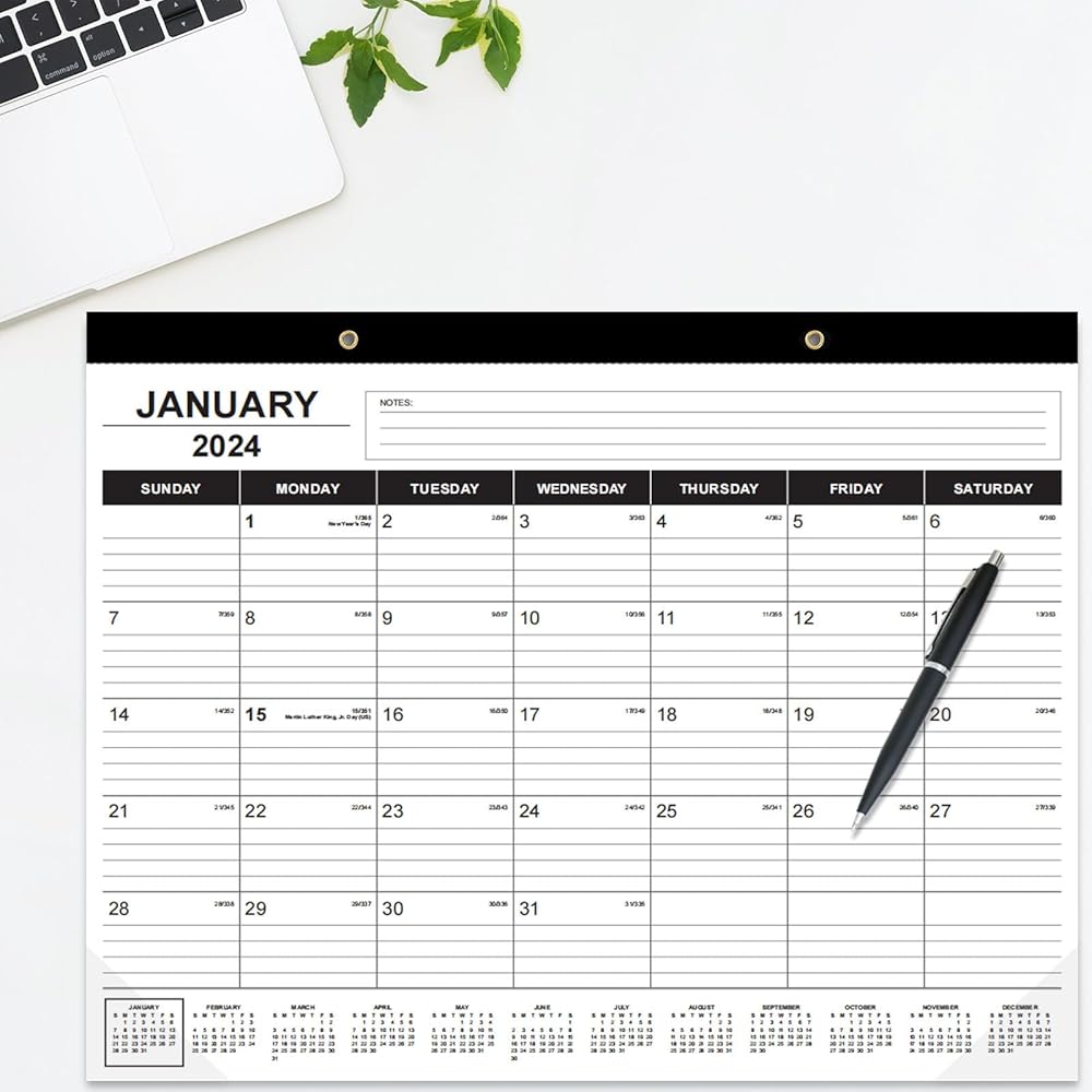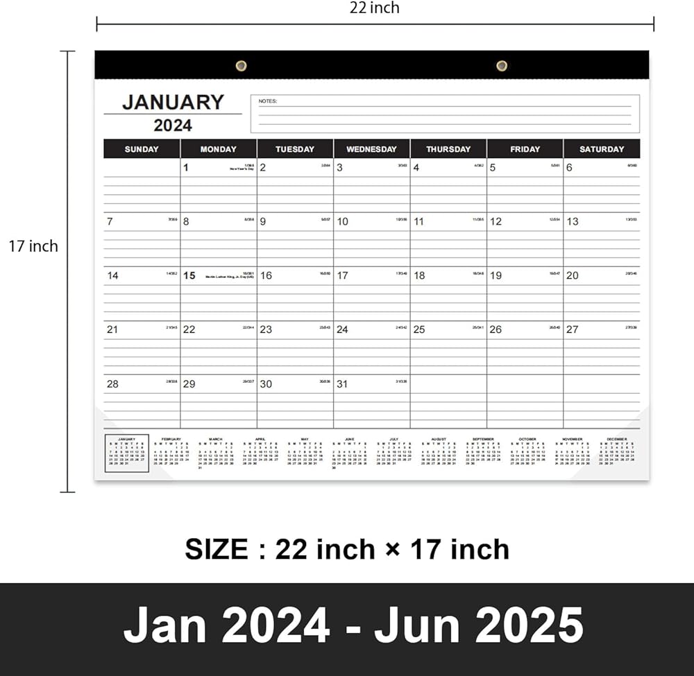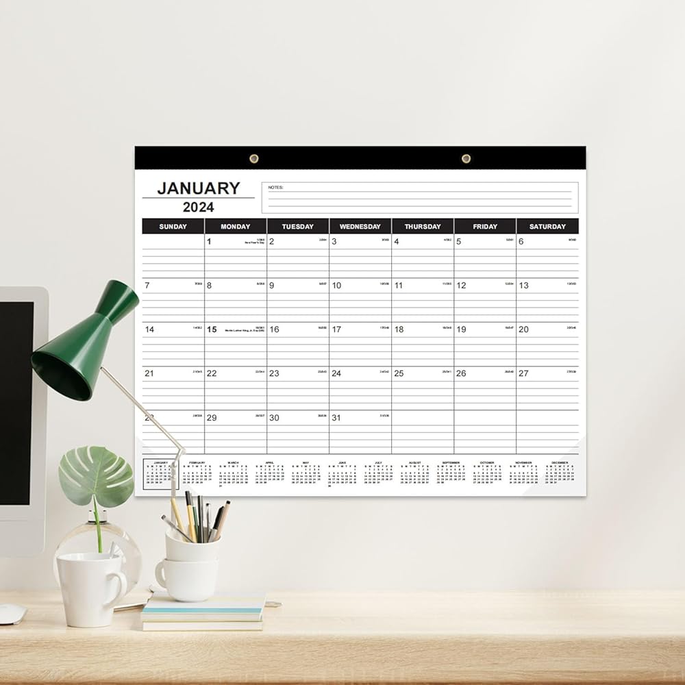 This 22x17 desk calendar is an large desktop calendar 2024-2025, perfect size for desk and wall. Each monthly view page of this desk calendar 2024 has ruled daily blocks for easy and clear daily planning, ample space for writing your daily schedulings, and there are additional sections for monthly notes.