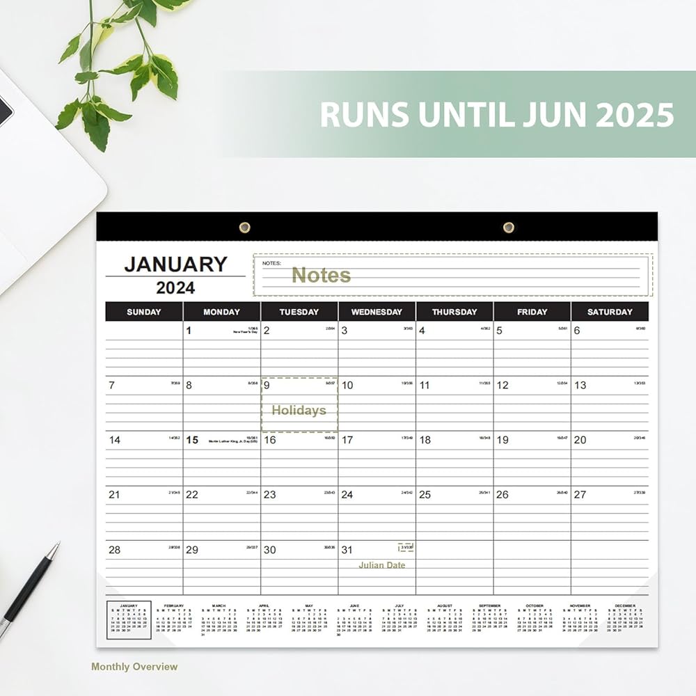 This classic and clear layout desk calendar 2024-2025 runs from January 2024 to June 2025, suitable for office, school and family/home with any decoration style. Each monthly view page of this large desk top calendar 2024-2025 marked important holidays and Julian dates, and has yearly overview calendar for long-term planning. This desktop planner preventing you from forgetting any appointments, deadlines, birthdays and other important occasions.