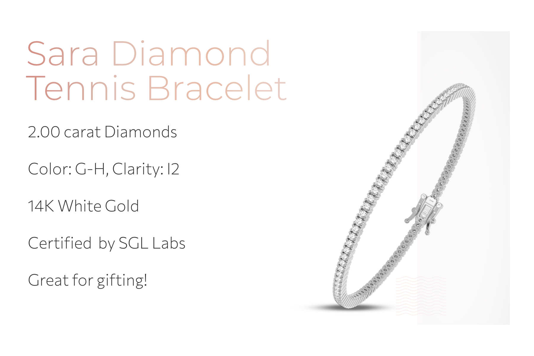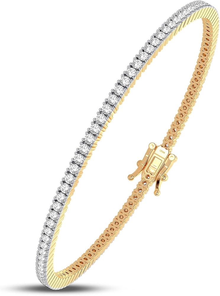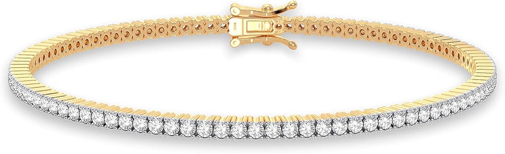 • أجود المواد: تم تصميمها بألماس 2.00 قيراط (اللون: G-H، الوضوح: I2) والذهب الأبيض الصلب عيار 14 قيراط. وزن المعدن: 8.80 جرام. طول السوار 7 بوصات وعرضه 2.40 ملم. يتم قطع كل ماسة يدويًا بإتقان على يد حرفيين محترفين لتحقيق أقصى قدر من التألق المبهر الذي نحبه!