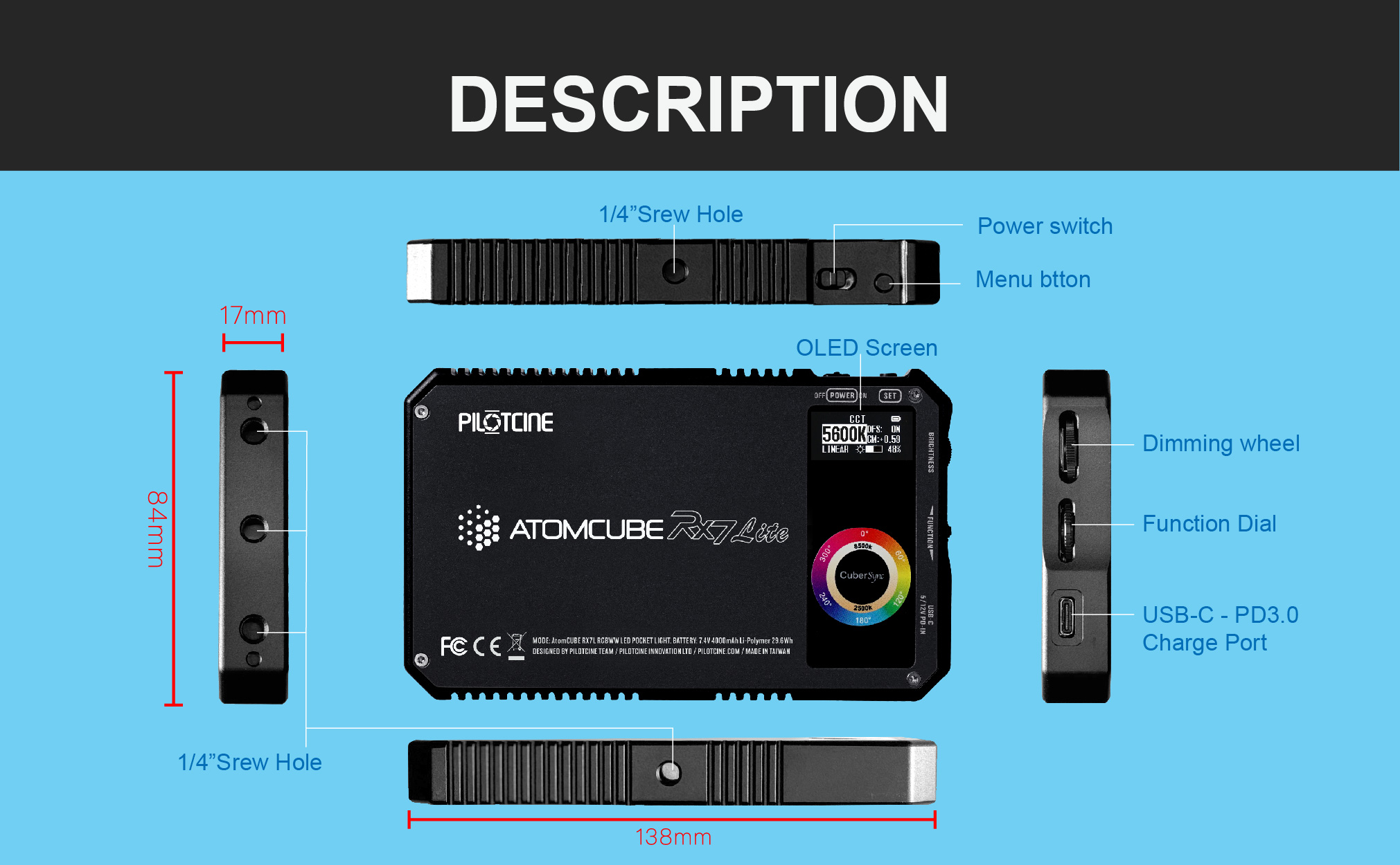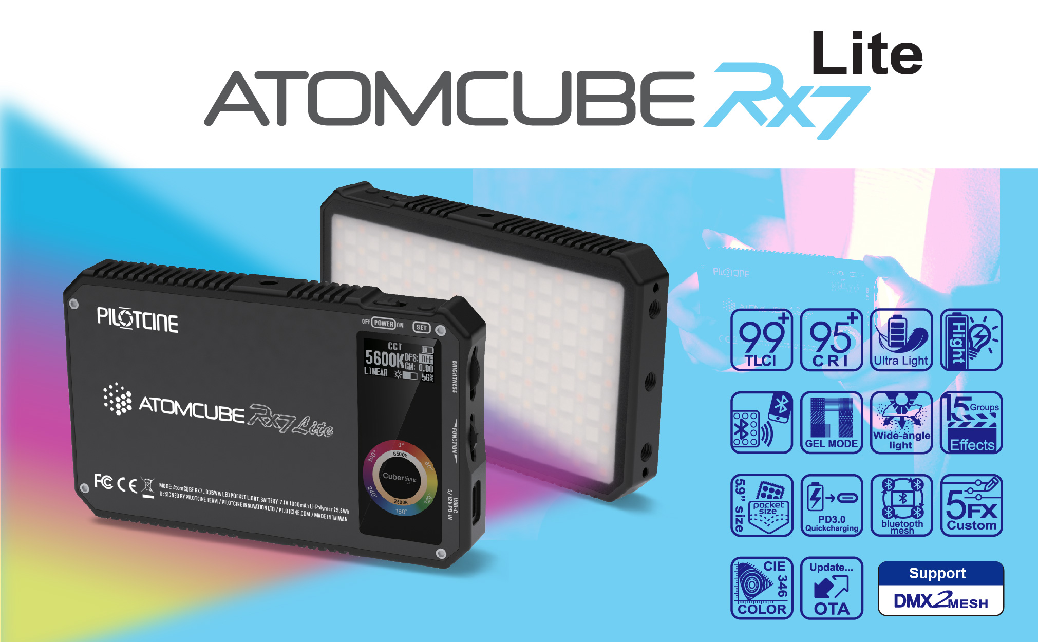 إن مصباح Atomcube RX7L RGBWW LED المحمول هو مصباح متعدد الوظائف متغير اللون بقدرة 18 وات مع وظيفة التحكم RGB. جميع وحدات الإنارة مصنوعة باستخدام الحاسب الآلي باستخدام ألومنيوم من فئة الطائرات مع أشكال زعانف لتبديد الحرارة. إن RX7L مناسب للتثبيت على الكاميرا، بمقاس 5.4 × 3.3 بوصة تقريبًا، ويسهل حمله في حقيبة اليد أو جيبك. تساعدك مكونات الإضاءة المركبة ثنائية اللون/RGB على استكشاف الإبداع. سطوع متغير يتراوح من 2500 إلى 8500 كلفن مع درجة حرارة محايدة.