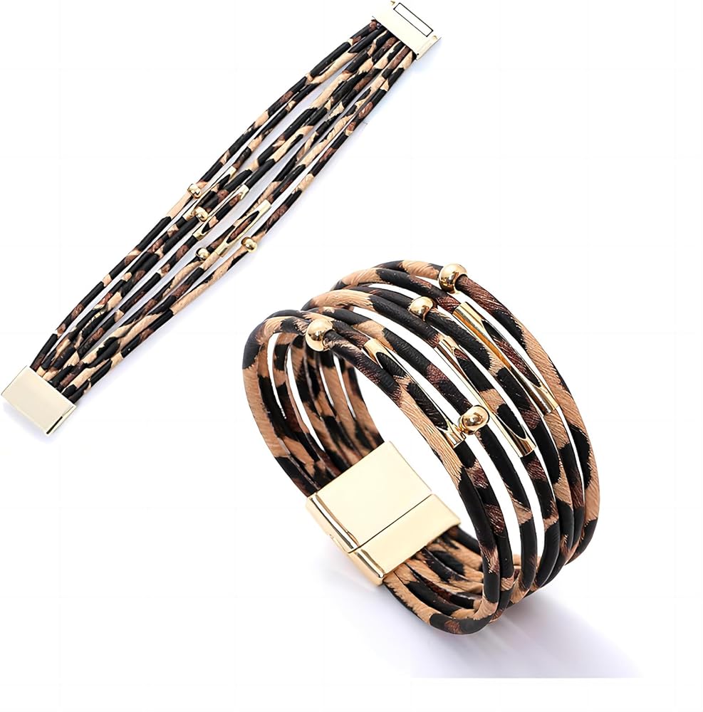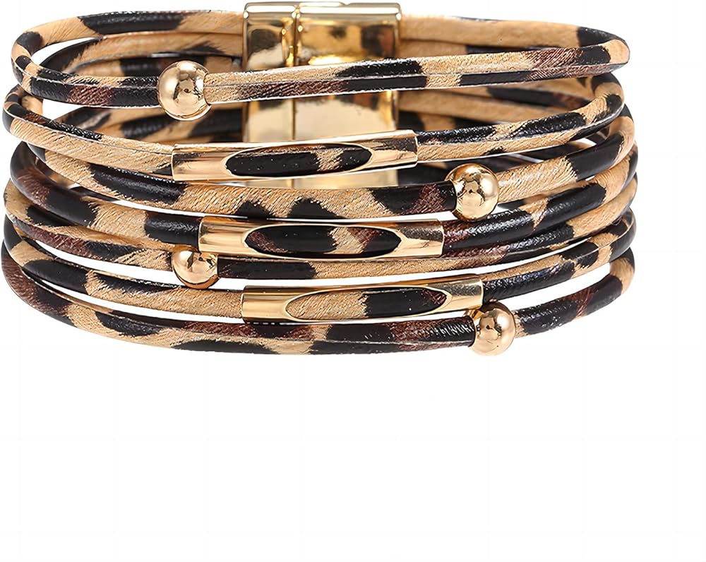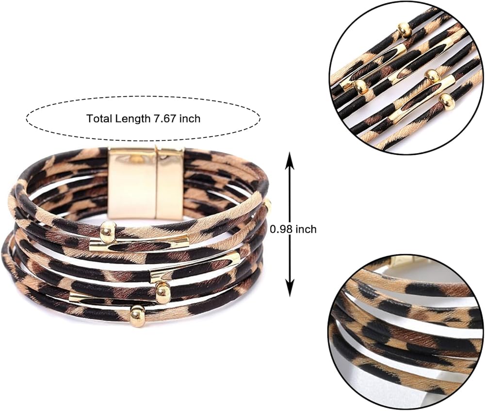 Unique Design: This women leather bracelet features multilayer Leopard print leather cord and combination with gold beads. Leopard print reflect a little of wild and sexy, it makes your wrist look more attractive.