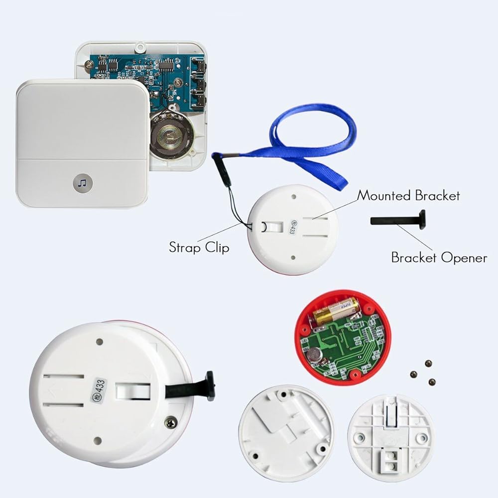 Transmitter/Push Call Button is Easy Carry. It can Be Put in Pocket. Or Hang on neck as Pendant. Neck Strap included. Fixed in Bedside/Washing Room. The Fixed Bracket and Double sticker are included