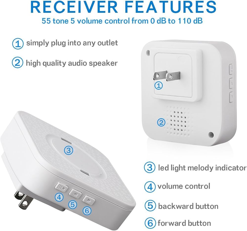 Pager/Chime Unit has 55 Ring Tones for Your Choice. Operating Range is 500+ Feet in open Area. 5 Level Adjustable Volume From 0db to 110db. Easy Use ( Plug and Play) Plug the Receiver into an Electrical Outlet