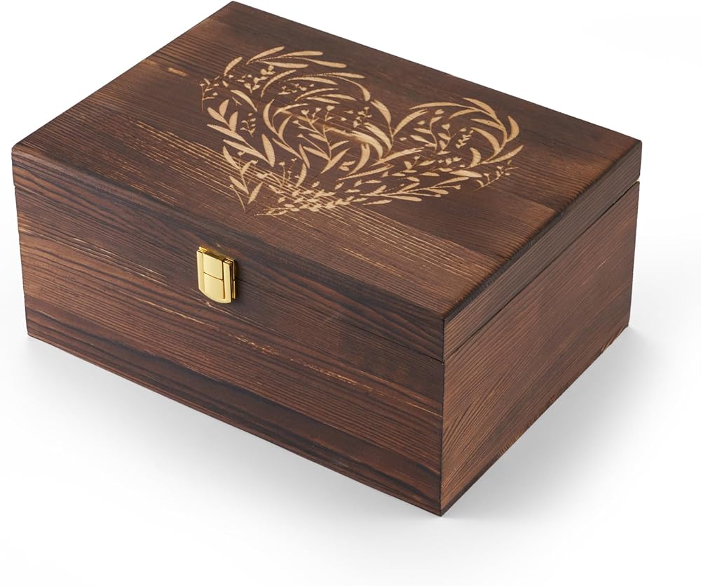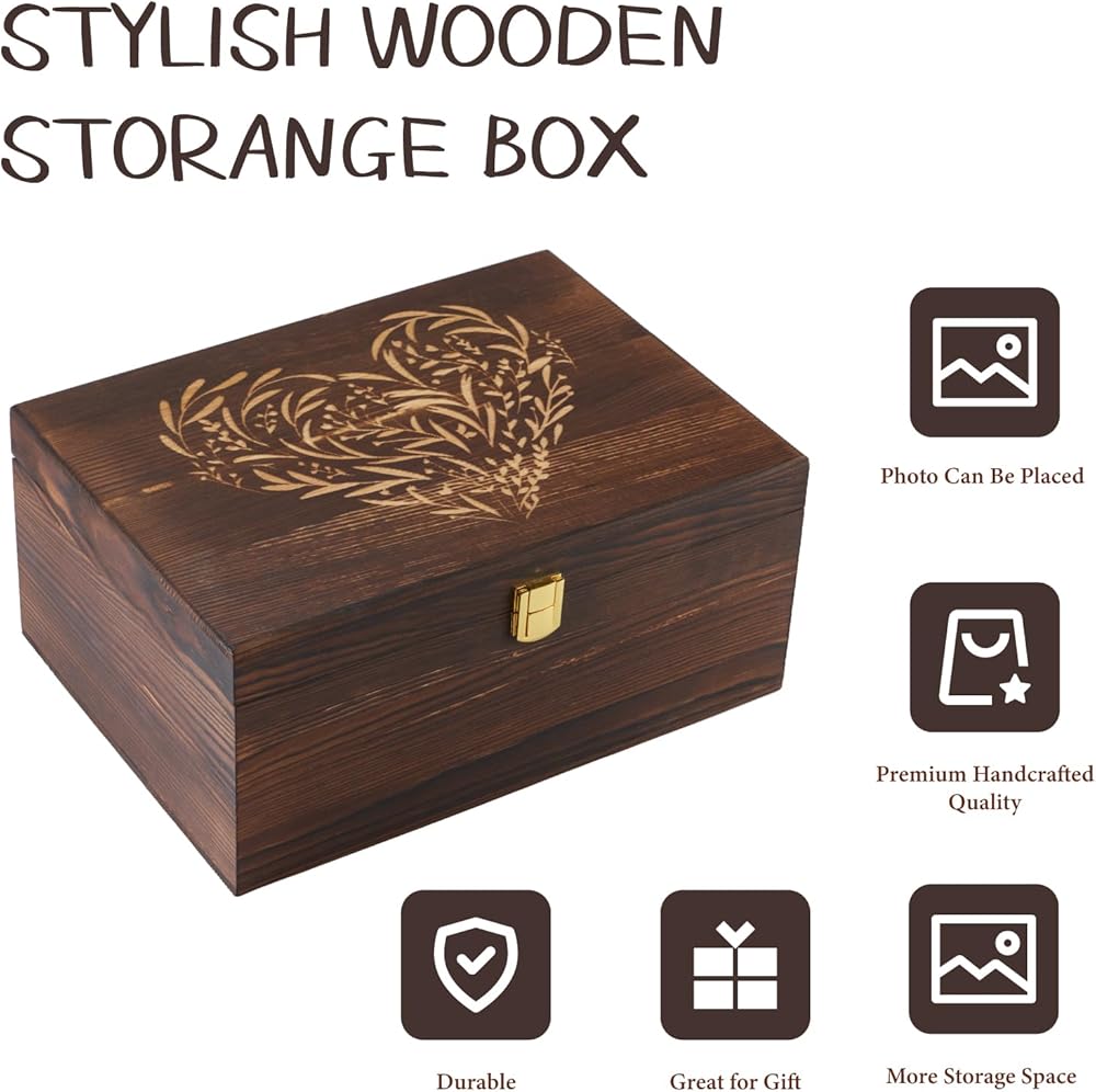 صناعة متقنة - متين وخالد مصنوع بعناية فائقة بالتفاصيل، صندوق التذكار الخاص بنا مصنوع من خشب عالي الجودة يضمن متانة طويلة الأمد. تم نقش الأنماط المعقدة على الغطاء بخبرة، مما يمنح الصندوق سحرًا خالدًا. يضمن هيكلها القوي سلامة ذكرياتك الثمينة، مما يجعلها قطعة موروثة مثالية لتمريرها عبر الأجيال.