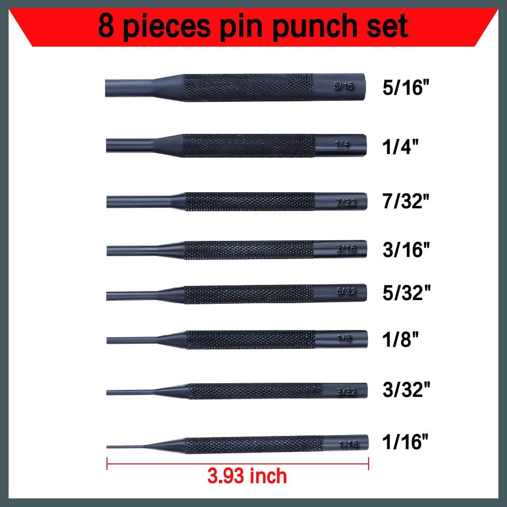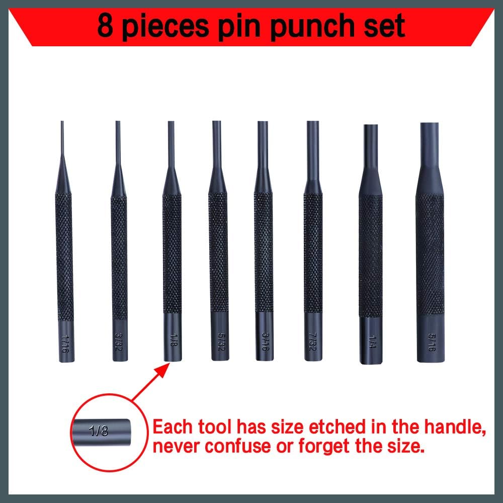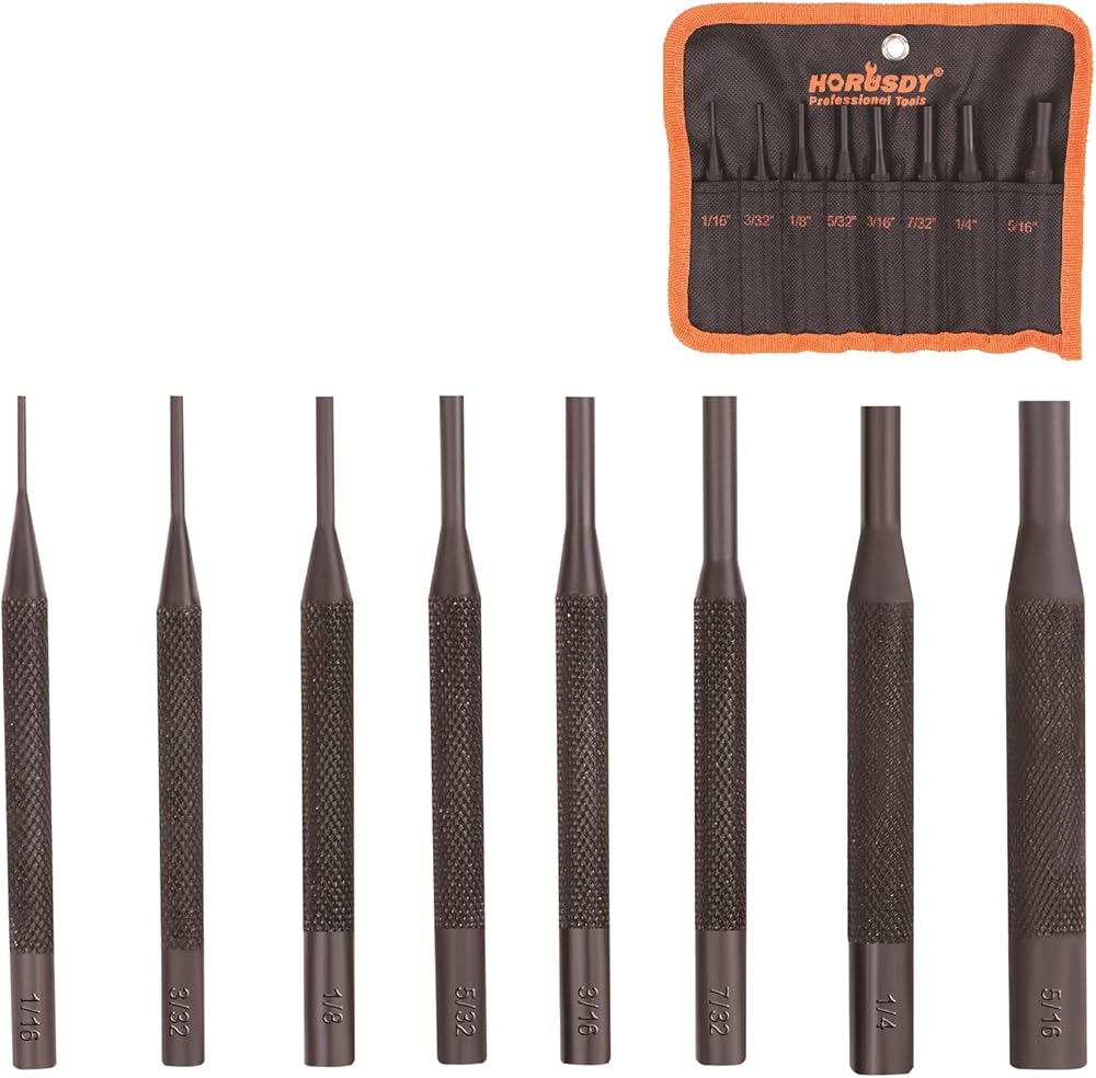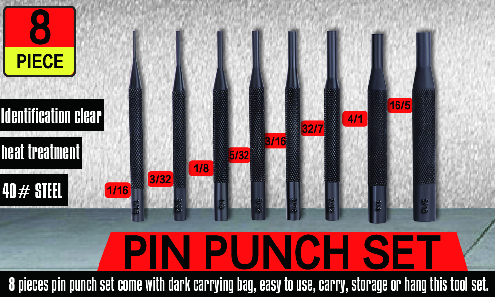 • Pin Punch Set عبارة عن مجموعة رائعة من الأدوات المصممة لإزالة المسامير الدوارة وإعادة استخدامها دون التسبب في تلف كبير للدبابيس.