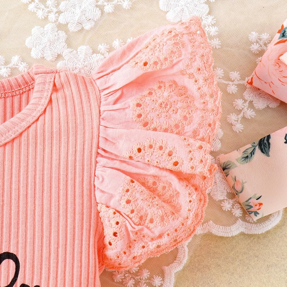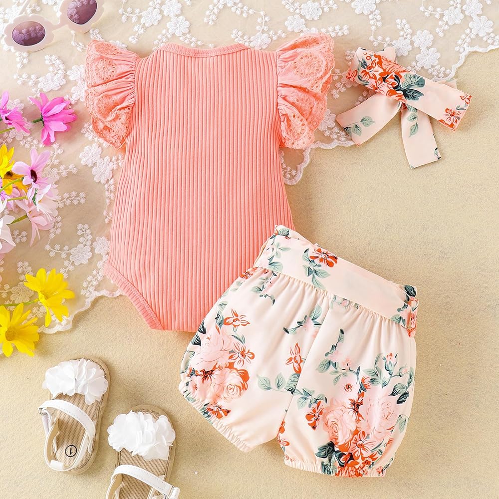 ما تحصل عليه: 1x رومبر محبوك مضلع بأكمام من الدانتيل + 1x شورت زهري مع حزام + 1x عصابة رأس على شكل فيونكة. طقم ملابس صيفي مكون من 3 قطع للأطفال حديثي الولادة من 0 إلى 6 أشهر. هدية استحمام لطيفة للفتيات حديثي الولادة، اترك ذكرى جميلة لأميرة طفلك.