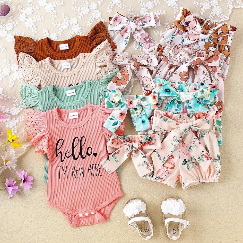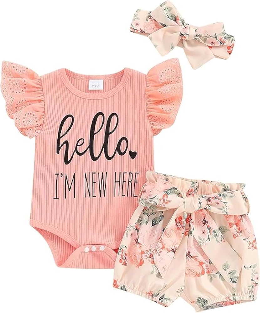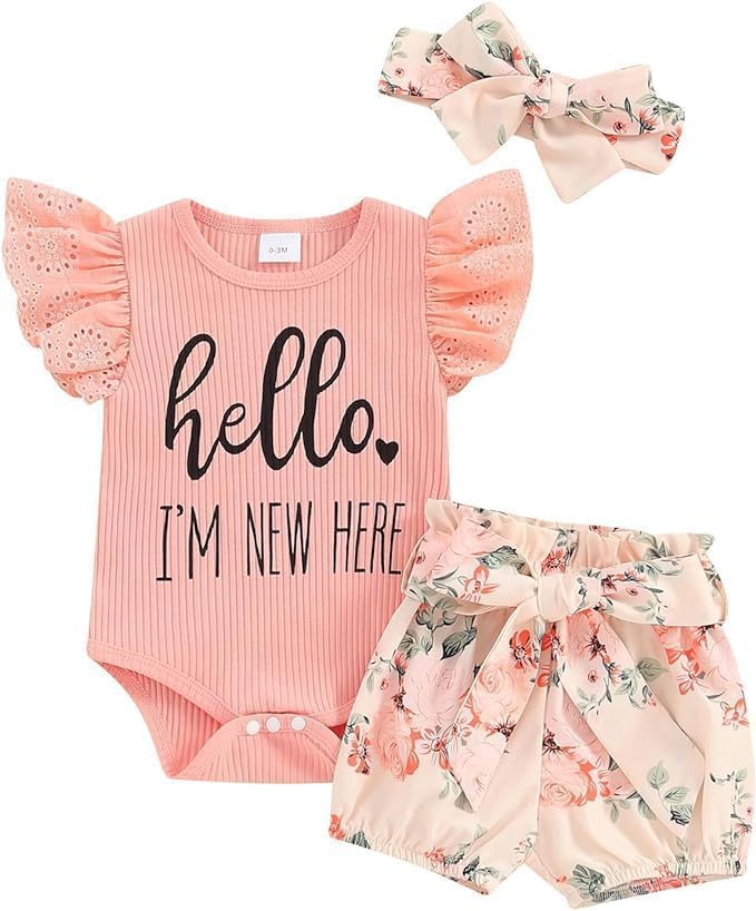 تصميم فريد: مجموعة ملابس زهور مكونة من 3 قطع للفتيات حديثي الولادة، ثوب فضفاض مضلع بأكمام من الدانتيل مع إغلاق سريع، طباعة حروف "Hello, I'm new here"، مما يجعل هذا الزي أكثر تميزًا ومثاليًا للفتيات حديثي الولادة، ويتوافق مع السراويل القصيرة المطبوعة بالزهور مع مجموعة الحزام وعقال.