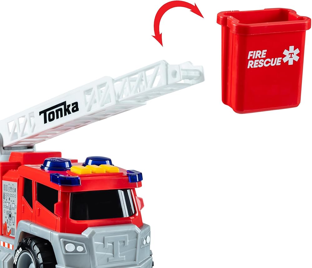 Realistic Actions: Prepare to embark on thrilling rescue missions with the red Tonka Crank and Haul Fire Truck. With its blazing sirens to the mesmerizing flashing lights, rotating working ladder to reach great heights, clip on Rescue Bin and vibrant red color, this fire truck is ready to ignite your imagination and save the day!