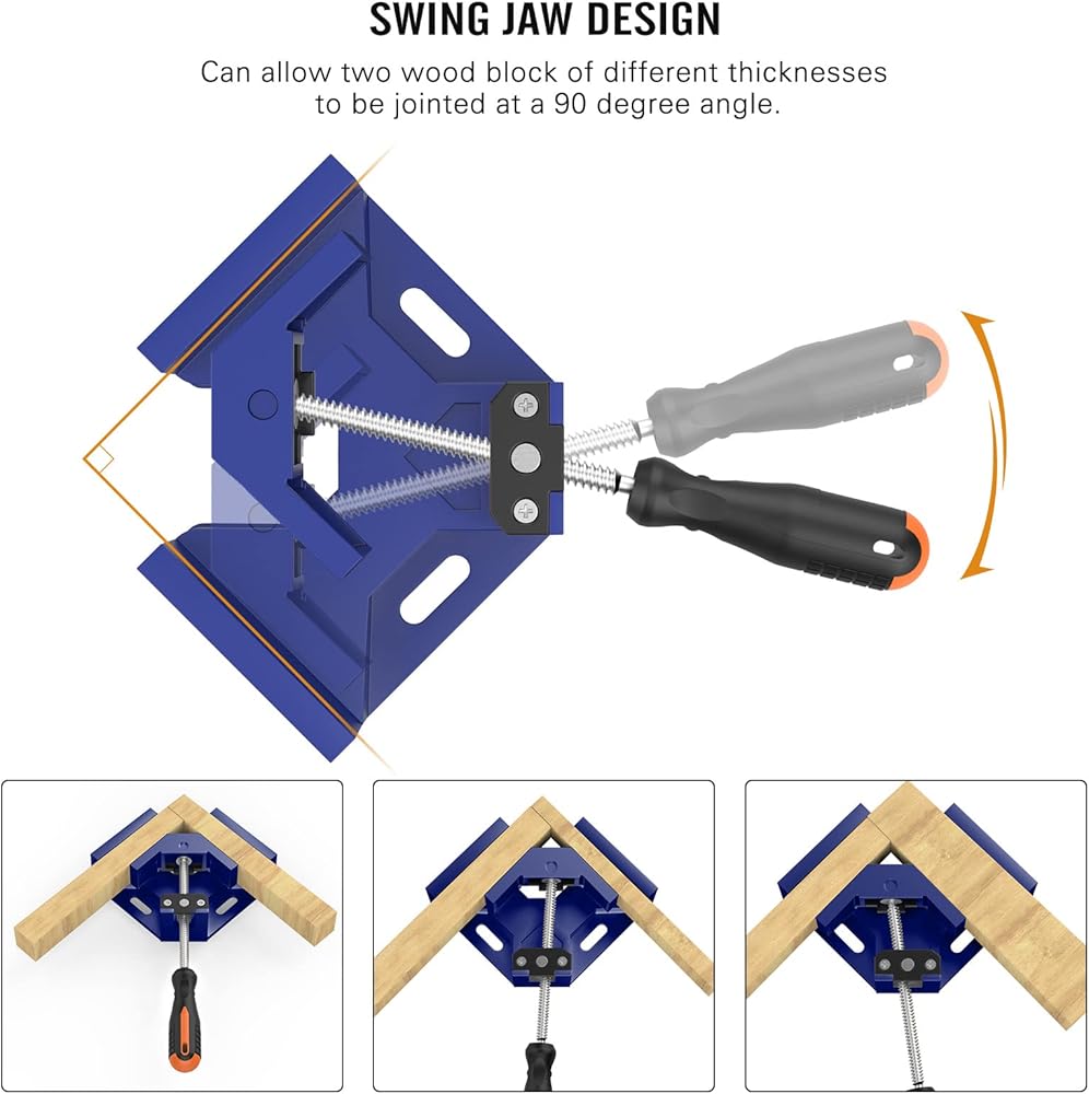 【تصميم فك متأرجح قابل للتعديل】: يمكن تدوير الفك ذو المقبض الواحد لمشابك النجارة هذه في اتجاهين، مما يسمح بربط سمكين مختلفين من القضبان أو الكتل بزاوية 90 درجة. سيعمل التصميم على إصلاح قطع العمل الخاصة بك بدقة.