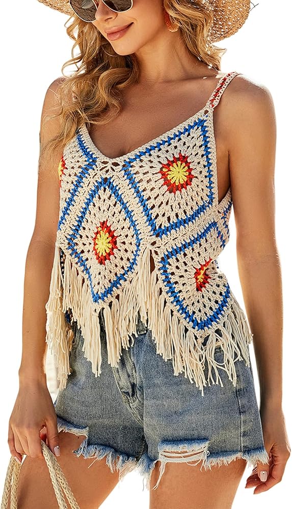 سترة نسائية من Gihuo مصنوعة من الكروشيه ومزودة بحاشية مهدبة بدون أكمام ومطرزة بالورود ومطرزة بوهو ملابس شاطئ (مشمش-L)