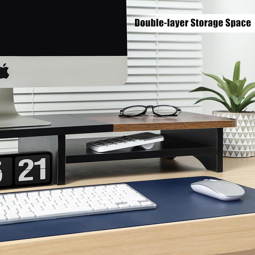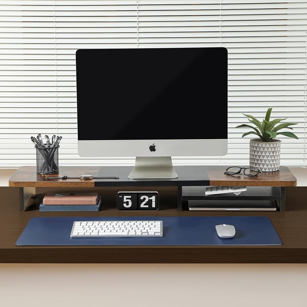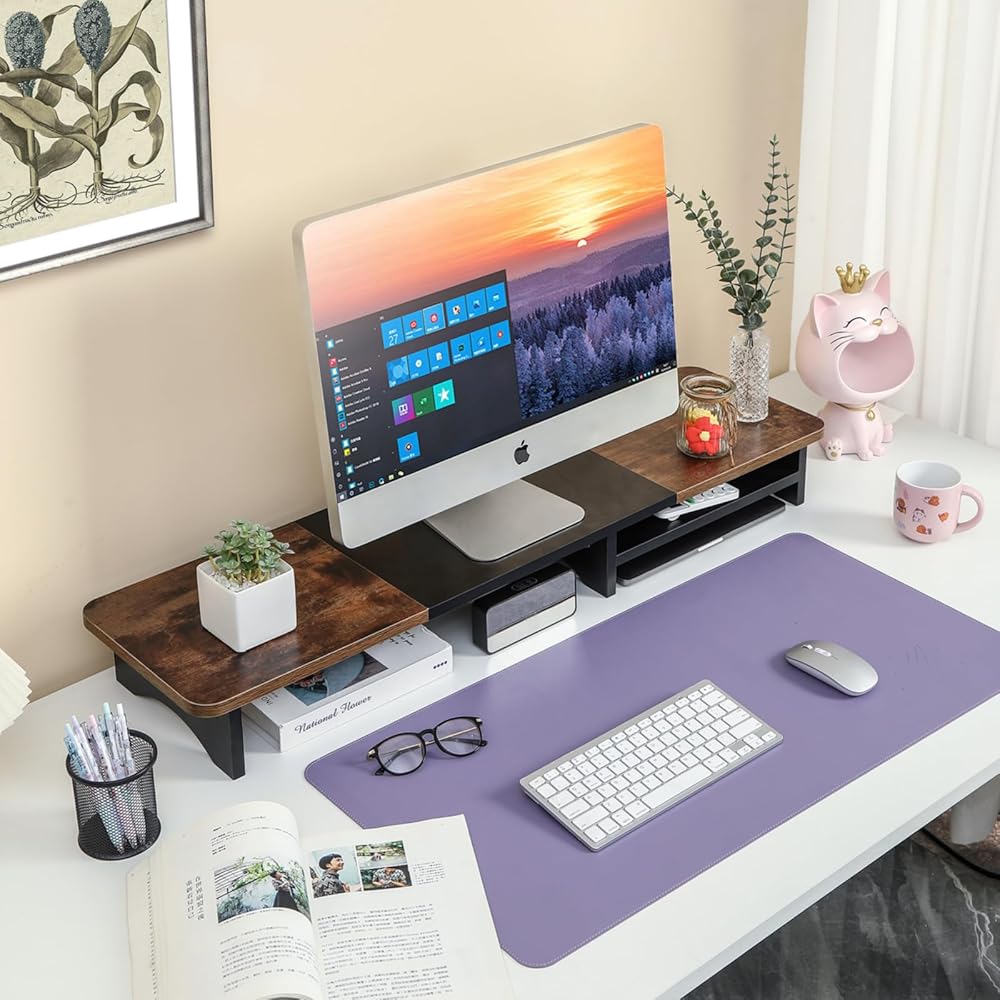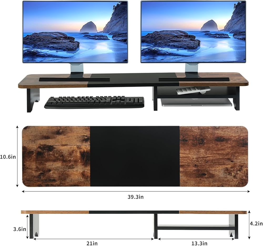 حامل شاشة مزدوج من ARCOBIS مع مساحة تخزين، رف منظم مكتب خشبي كبير مقاس 39.3 بوصة، حامل شاشة كمبيوتر لشاشتين، حامل منظم سطح المكتب متعدد الأغراض للكمبيوتر والكمبيوتر المحمول والطابعة والتلفزيون