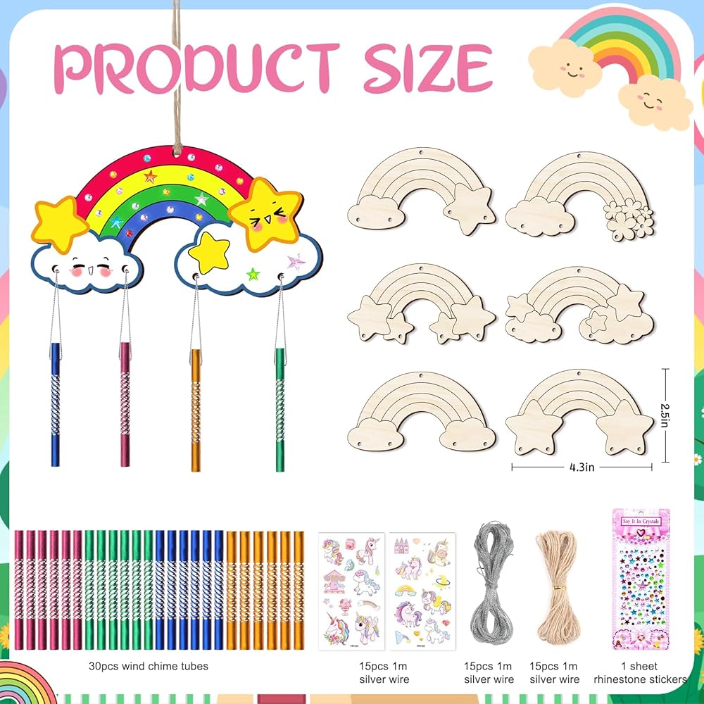 【Wind Chime Kits】You will get 12pcs unfinished wooden unfinished rainbow cutouts in 6 styles, 48pcs wind chime tubes in 4 colors, 15pcs 1m silver wire, 1 roll jute rope, 1 sheet rhinestone stickers, 2 sheets tattoo stickers, great value DIY art crafts kits for kids
