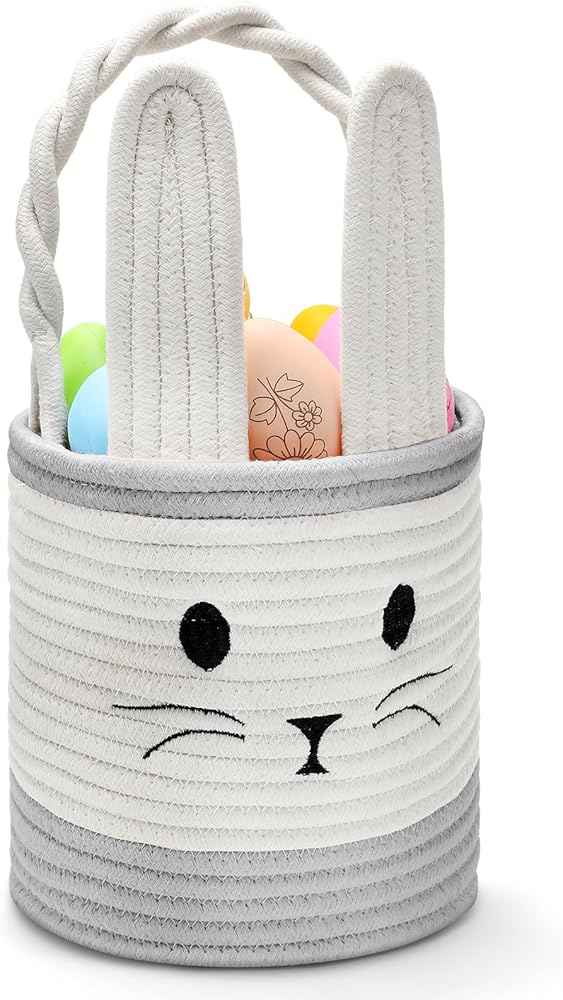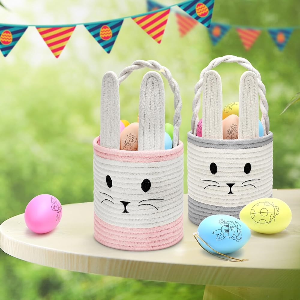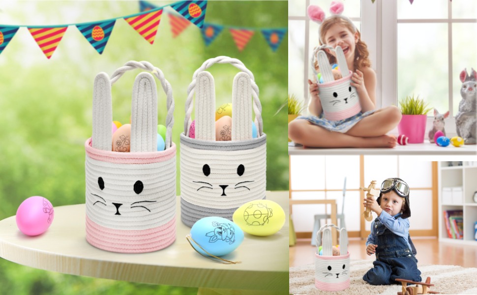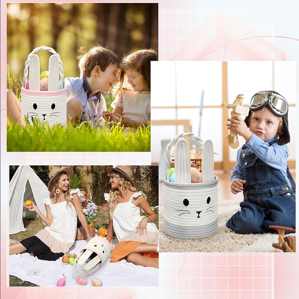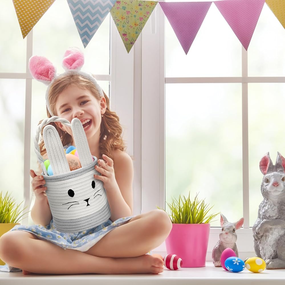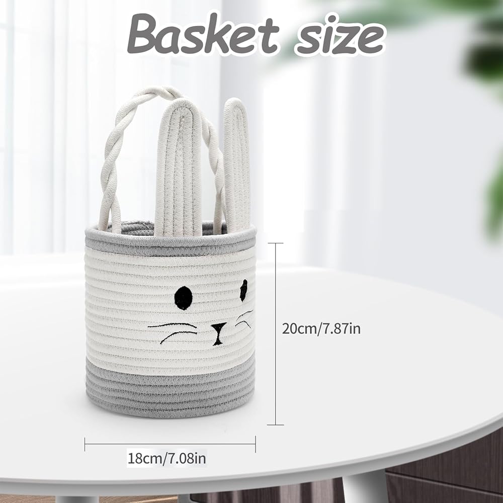 سلة عيد الفصح المنسوجة مع مقبض، سلة أرنب الطفل المطرزة حبل سلة تخزين الحضانة للأطفال مع آذان أرنب لعبة سلة هدايا فارغة لتخزين الحلوى لعبة فتاة لوازم الحفلات