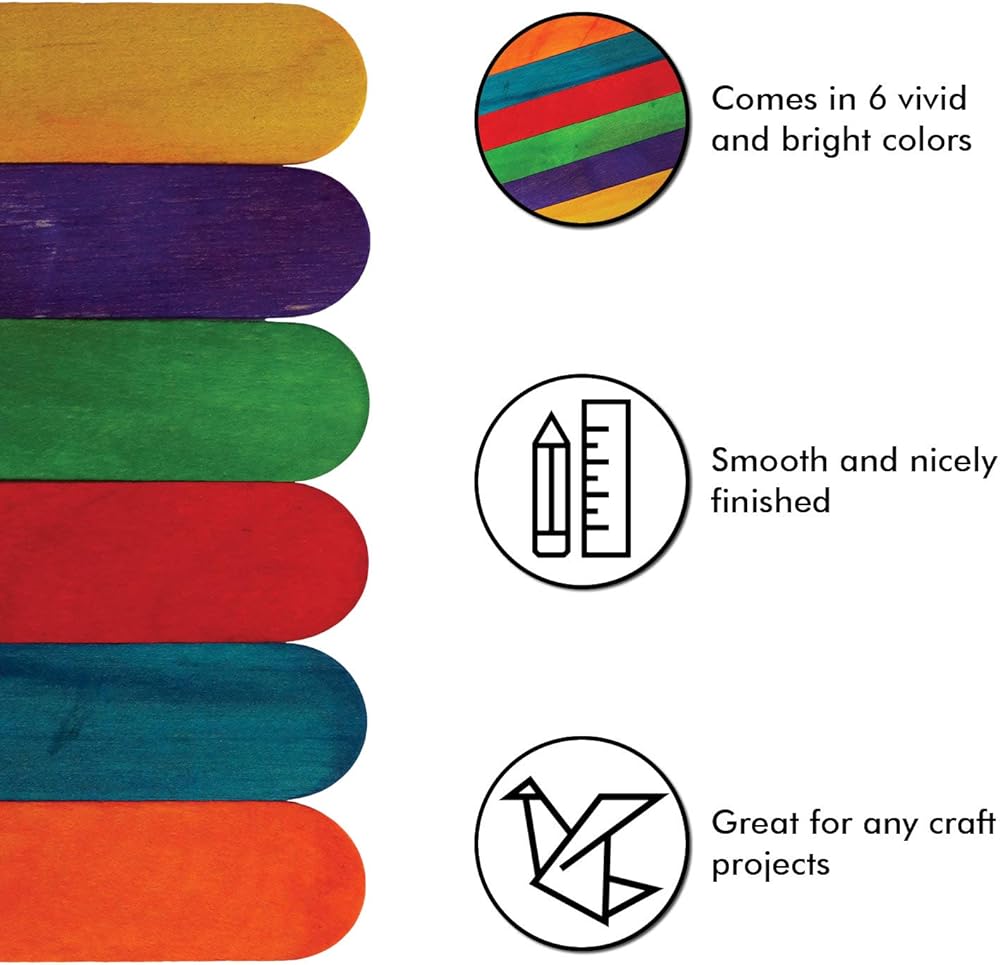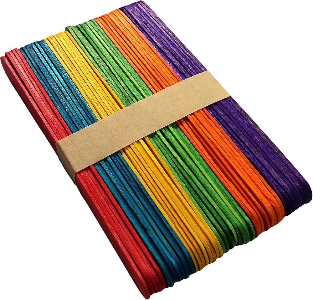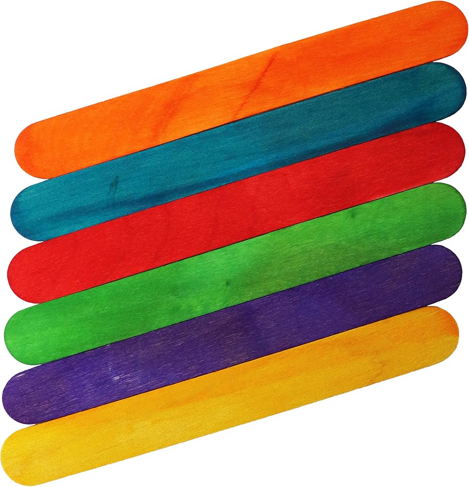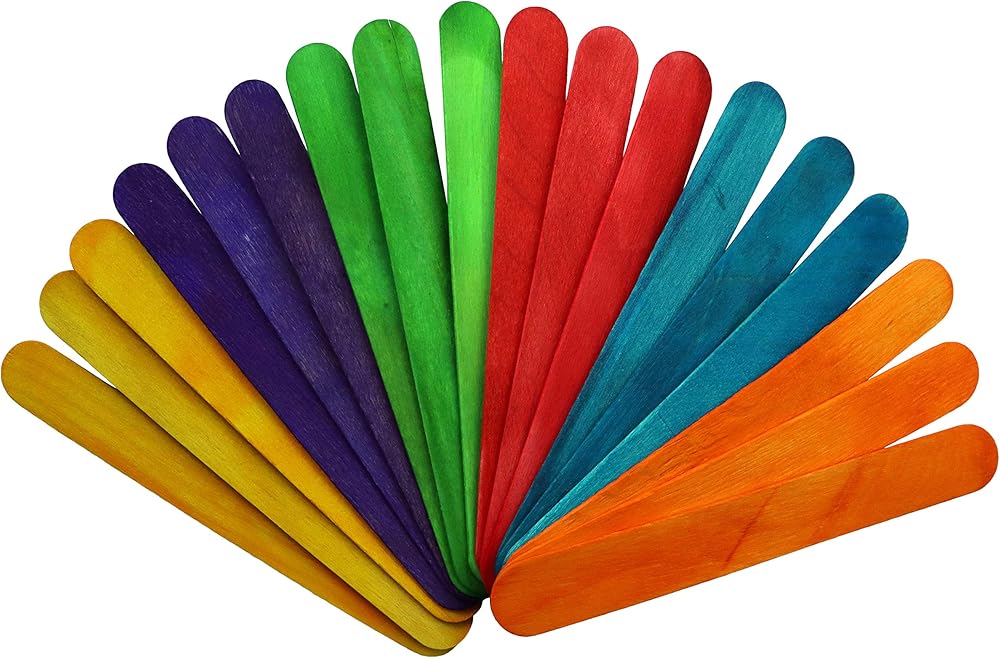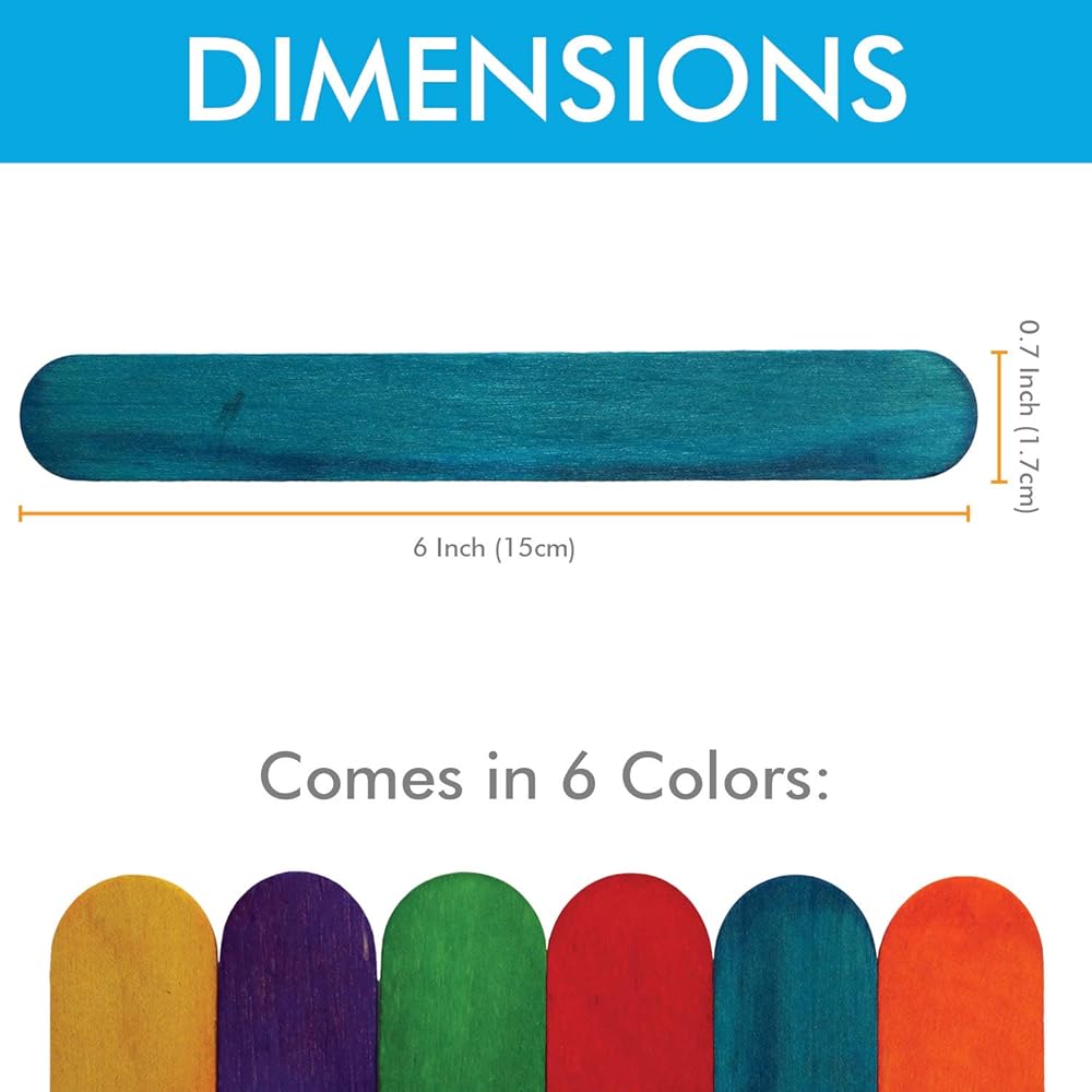 يبلغ مقاسها 6 بوصات طولًا × 0.7 بوصة عرضًا (15 سم × 1.7 سم). تأتي في 6 ألوان زاهية ومشرقة - الأزرق والأحمر والأصفر والأخضر والبرتقالي والأرجواني. تأتي كل مجموعة مع 100 قطعة من العصي الحرفية.