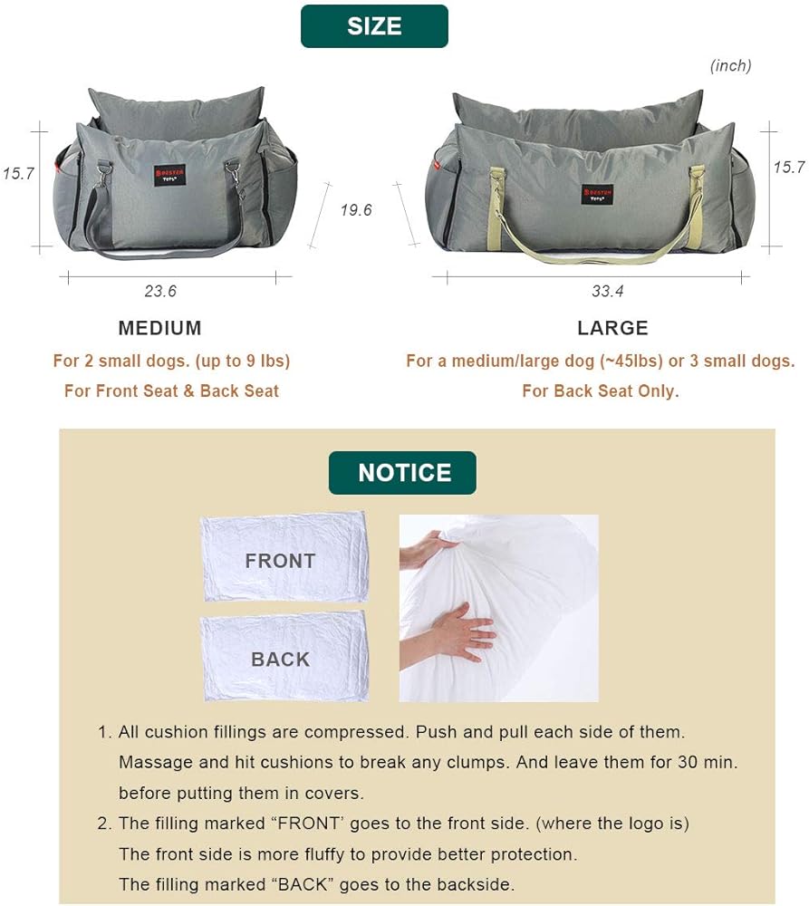 فسيحة. المقعد مخصص لكلبين صغيرين أو كلب واحد متوسط أو كبير الحجم. مقاس المقعد المعزز 22 بوصة (طول) × 20 بوصة (عرض) × 16 بوصة (ارتفاع) / ارتفاع الوسادة الجانبية 12 بوصة. لكل من استخدامات المقعد الأمامي والخلفي.