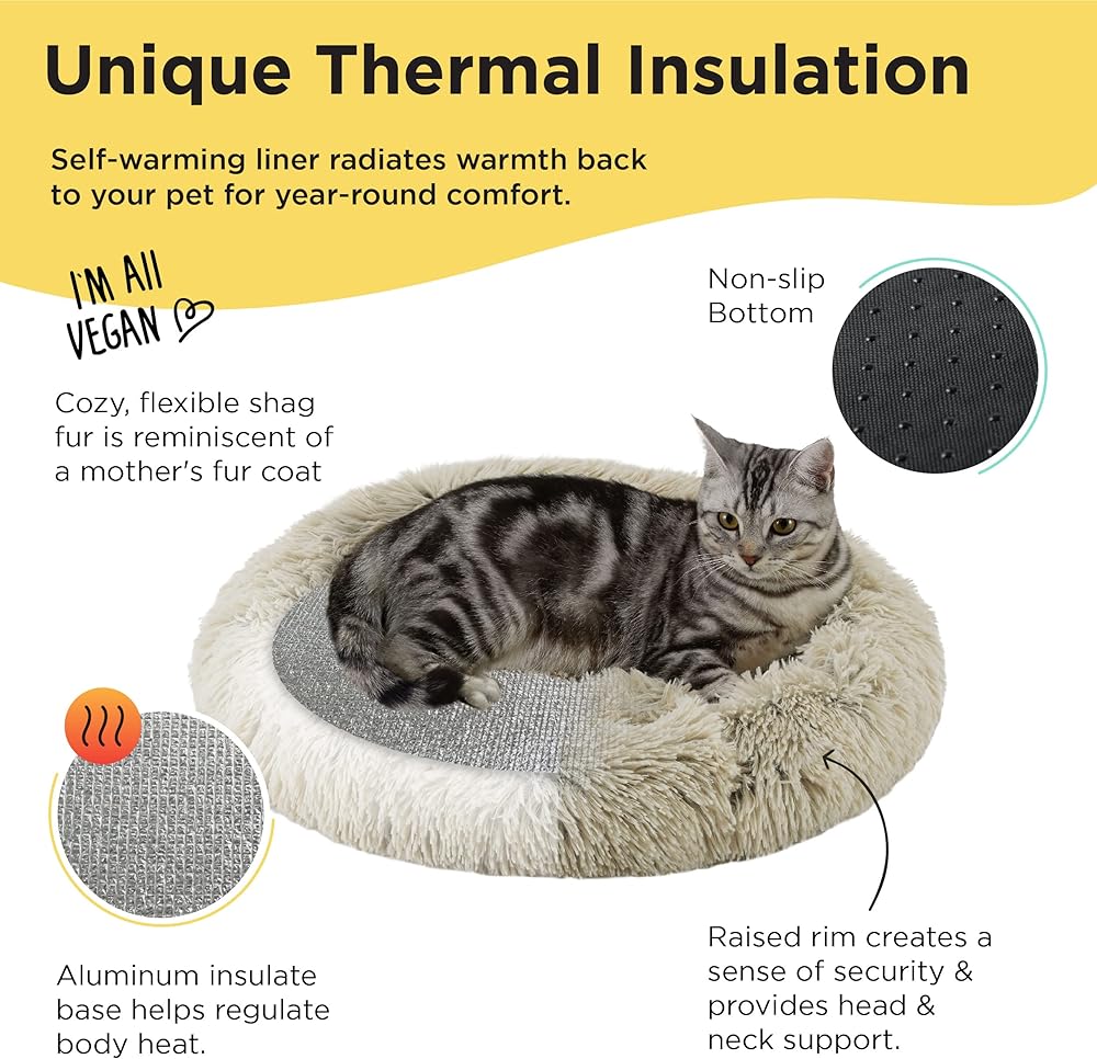SELF-WARMING: Cozy, flexible, and finished with vegan faux shag fur, our self-warming luxury cat bed pad is reminiscent of a mother's fur coat. Aluminum insulate 1/4" base helps regulate body heat to keep your cat warm and comfortable.
