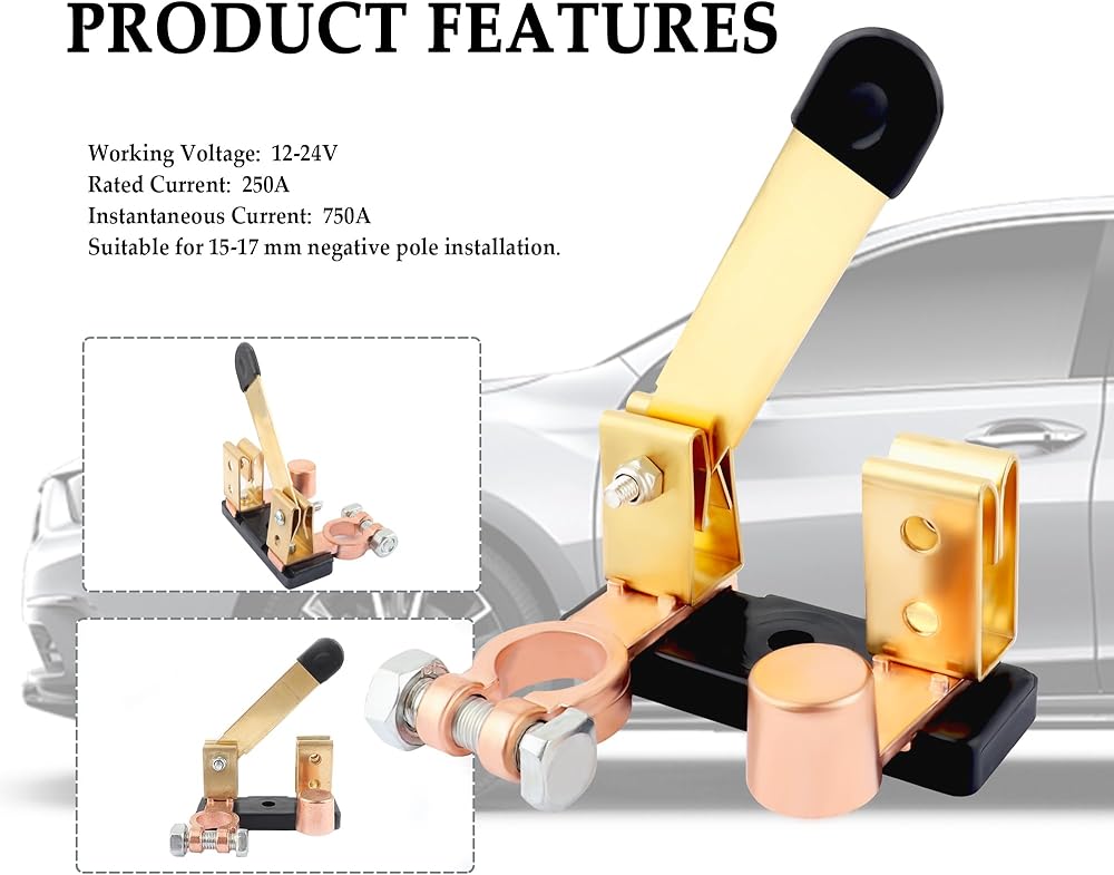 • ⚙️ Easy to Install and Use: First remove the negative pole of the original car, then put the switch on the negative stake head of the original car. Adjust the right angle to fix the negative pole of the original car on the other end. Trigger the blade control lever upward to disconnect the power, and press it downward to energize. Finally, just use a wrench to fasten the screws tightly.