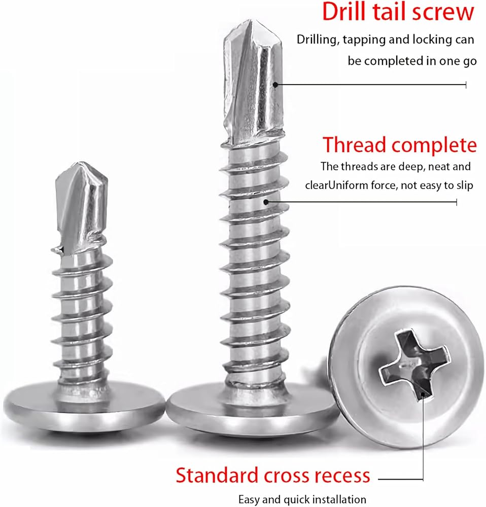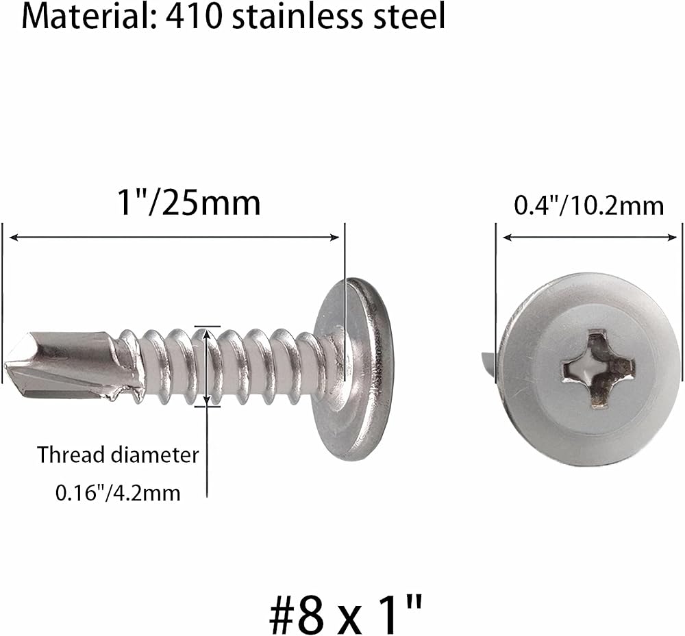 ✅【Package included】Includes 200 pieces of #8×1" cross round head self-drilling screws. Nominal thread: #8/M4.2, major thread diameter: 0.16"/4.2mm, screw length: 1 inch/25mm.