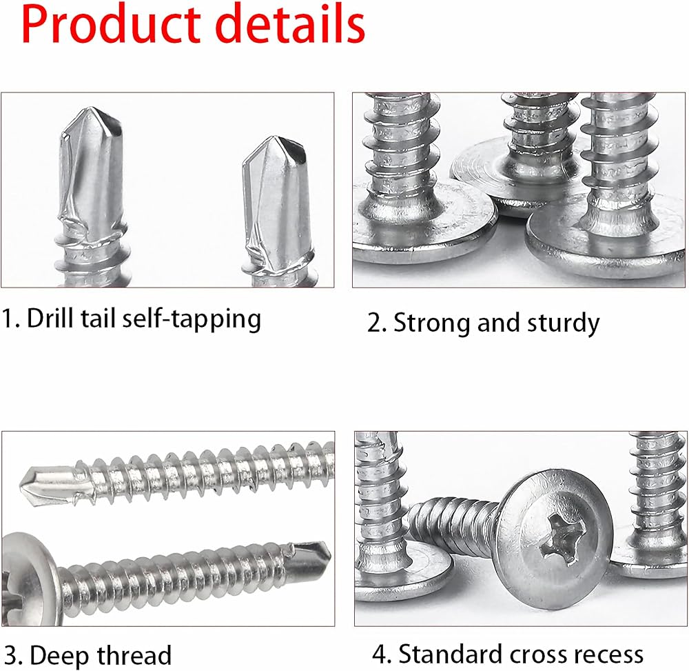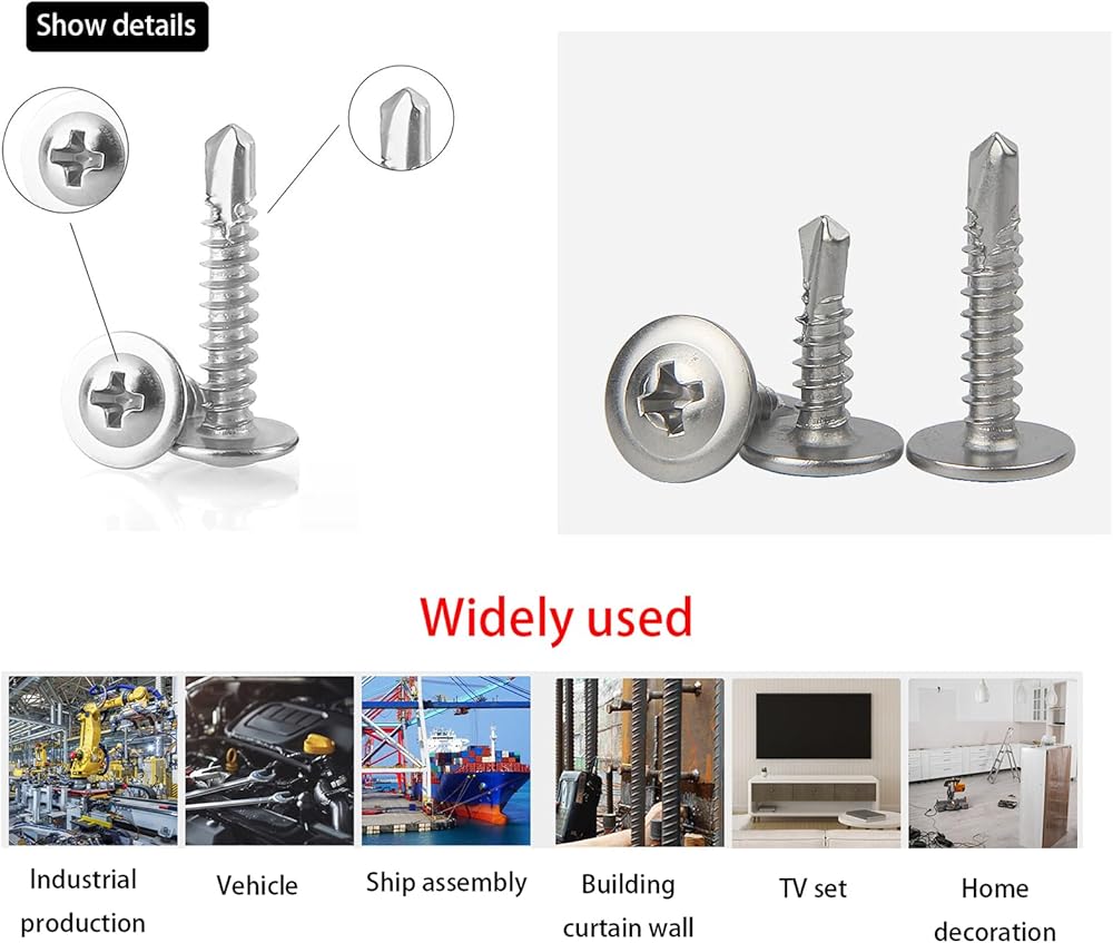 ✅【Multipurpose】410 stainless steel Self-tapping screws can easily pass through a variety of materials, such as plastic steel, stainless steel plates, color steel plates, aluminum alloys, magnesium titanium alloys, wood, plywood, plastics, bricks, etc. Suitable for furniture repair, floor fixing, door handles, mechanical industry, garage, wall beam connection, etc.