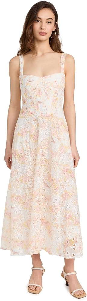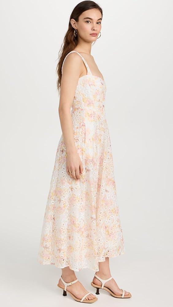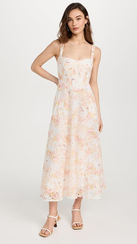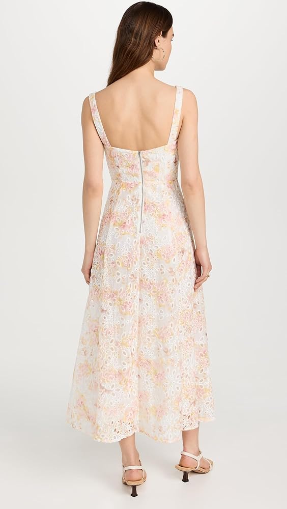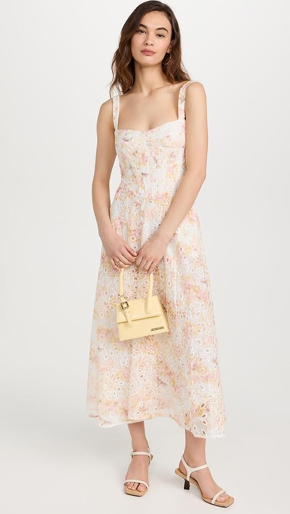 يعمل حسب الحجم. قد ترغب تلك الموجودة بين الأحجام في زيادة حجمها؛ الملاءمة مريحة من خلال الصدرية. ، مقصوص بشكل ظلي على شكل حرف A وطول متوسط. يوفر الفستان الحد الأدنى من التغطية عند الصدر. نسيج رامي لا يتمدد ويتميز بتطريز على شكل فتحات على كامل التصميم. يوصى باستخدام شريط الموضة لتأمين أحزمة الكتف.