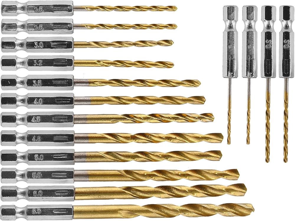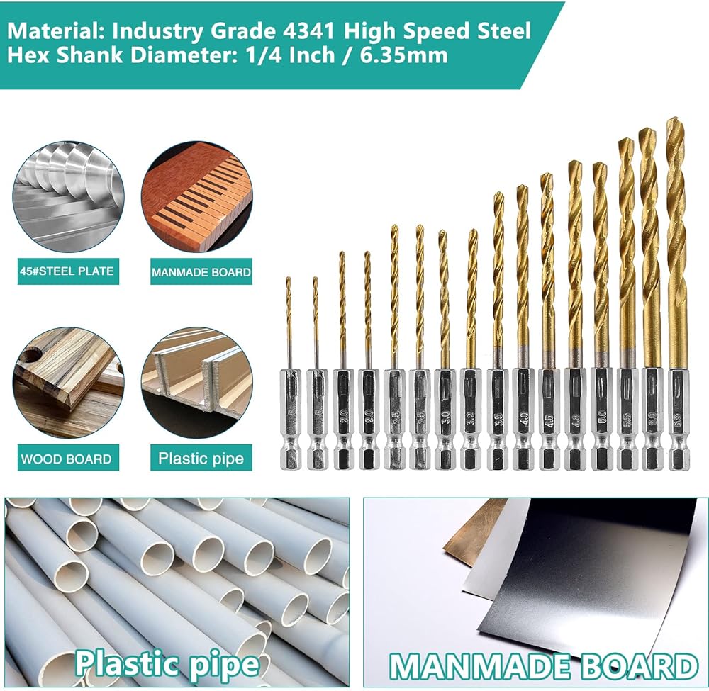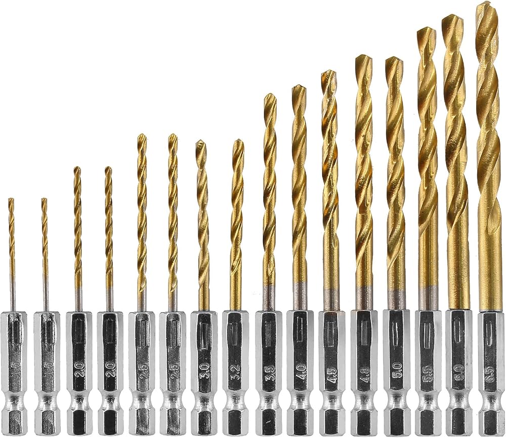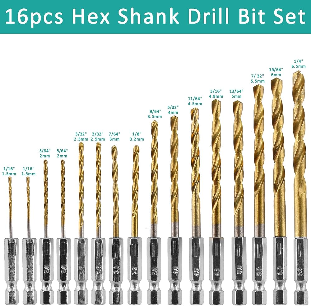 • Package Contains: 16 x Hex Quick Change Drill Bits, Hex Drill Bits Sizes: 2 x 1/16" / 1.5mm, 2 x 5/64" / 2mm, 2 x 3/32" / 2.5mm, 7/64" / 3mm, 1/8" / 3.2mm, 9/64" / 3.5mm, 5/32" / 4mm, 11/64" / 4.5mm, 3/16" / 4.8mm, 13/64" / 5mm, 7/ 32" / 5.5mm, 15/64" / 6mm, 1/4" / 6.5mm, Hex Shank Diameter: 1/4 Inch / 6.35mm.