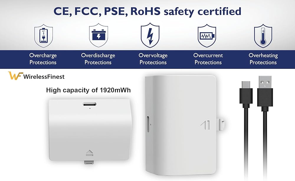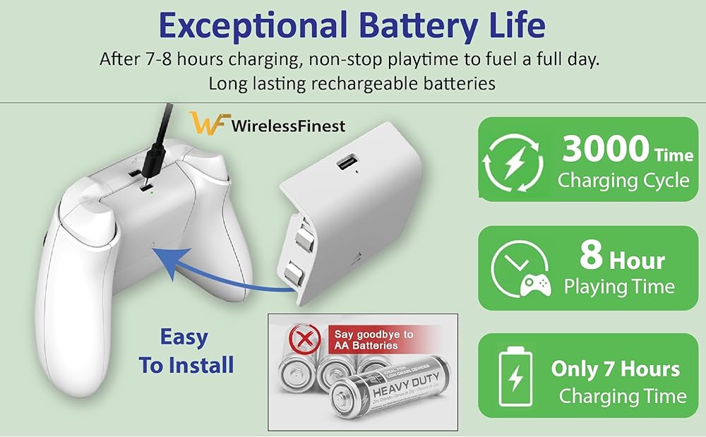 بطارية موثوقة ذات تصميم آمن لأجهزة Xbox، حماية الشحن الذكي المضمنة تحمي بشكل كامل حزمة البطارية القابلة لإعادة الشحن لأجهزة Xbox، مما يضمن السلامة أثناء عملية الشحن. لا مزيد من القلق بشأن قصر الدائرة الكهربية، والشحن الزائد، والتيار الزائد، والجهد الزائد، والسخونة الزائدة. يمكنك تركه يشحن طوال الليل بأمان.