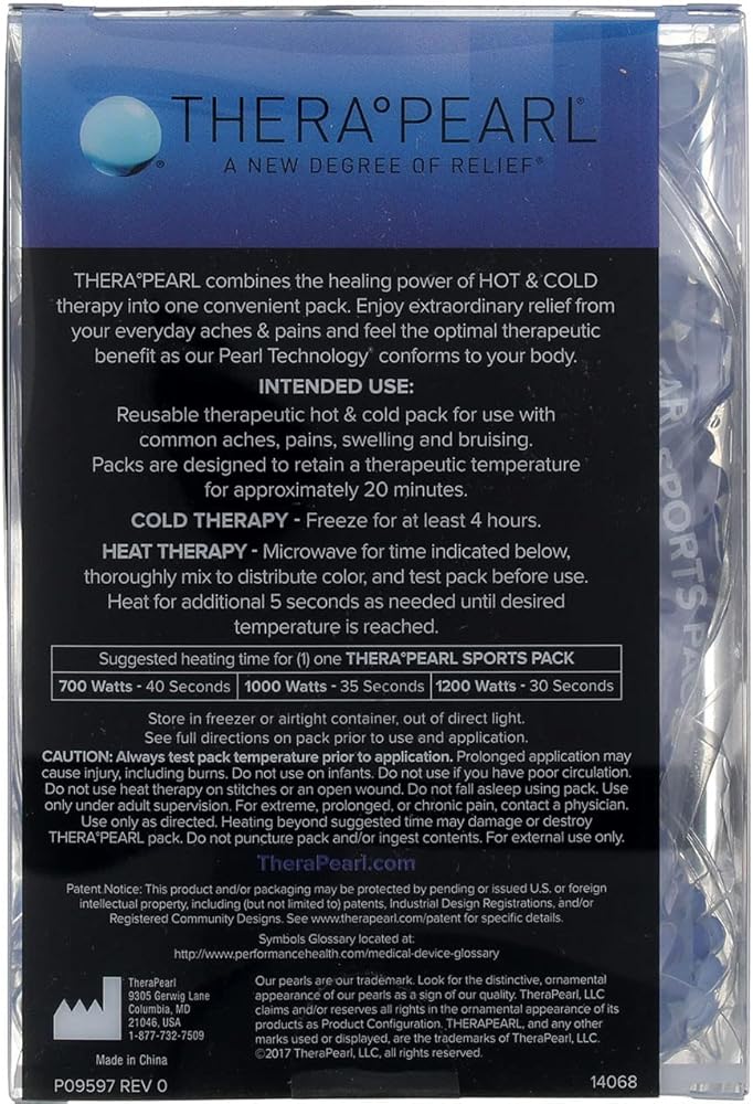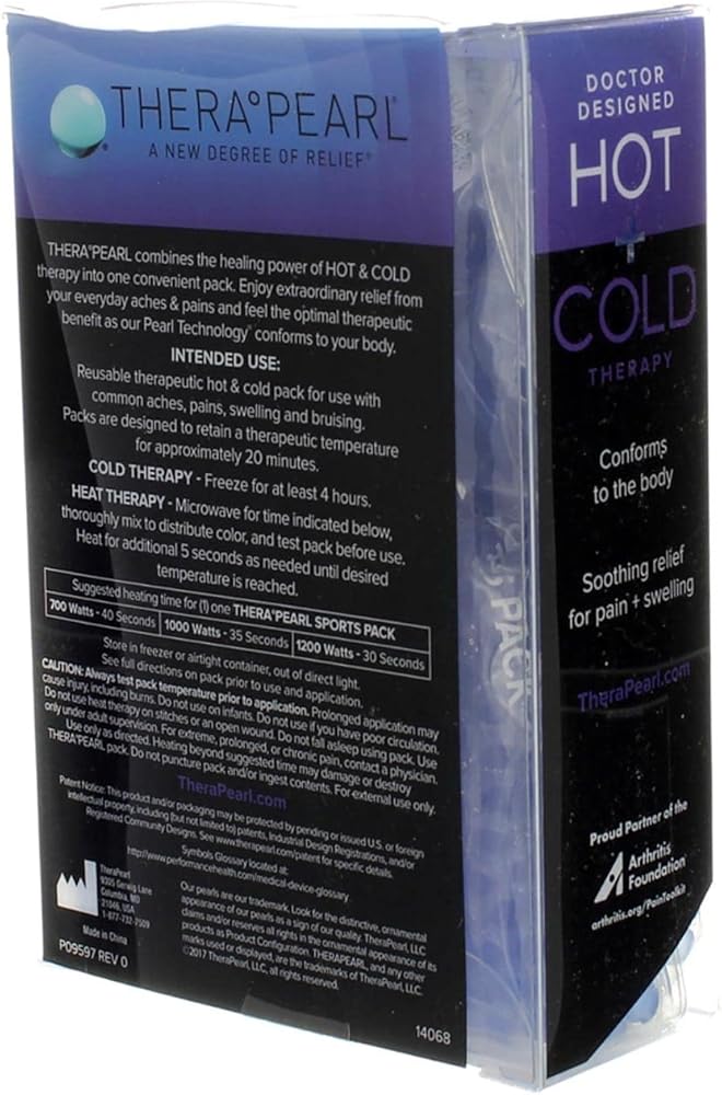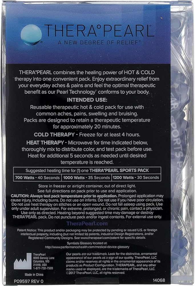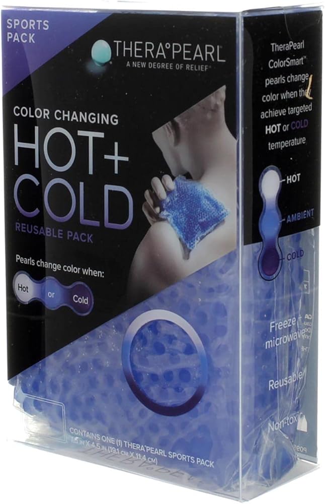 TheraPearl combines the healing power of Hot & Cold therapy into one convenient pack. Enjoy extraordinary relief from your everyday aches and pains and feel the optimal therapeutic benefit as the Pearl Technology conforms to your body. INTENDED USE: Reusable therapeutic hot and cold pack for use with common aches, pains, swelling and bruising. Packs are designed to retain a therapeutic temperature for approximately 20 minutes. Cold Therapy: Freeze for at least 2 hours Heat Therapy: Heat in microwave for specified time Reusable Hot & Cold Therapy Conforms to your body to deliver soothing relief from: Sore Muscles / Arthritis Swelling / Inflammation Aches / Pains and More! Contains one TheraPearl Sports Pack with Strap - 7.5in x 4.5in (19.1cm x 11.4cm)