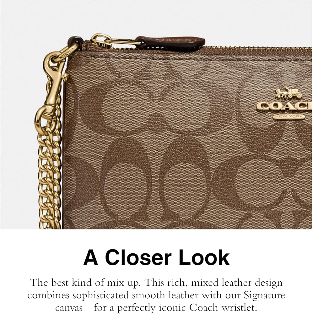 • Our Signature Canvas: The best kind of mix up. This rich, mixed leather design combines sophisticated smooth leather with our signature canvas - for a perfectly iconic Coach wristlet