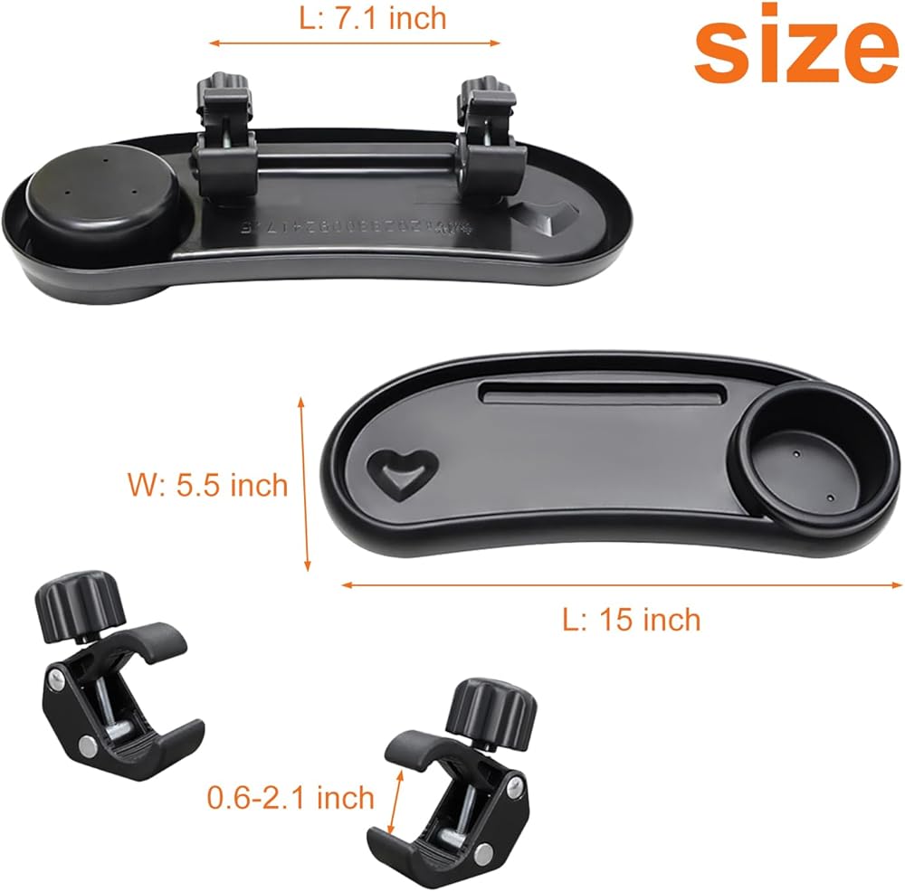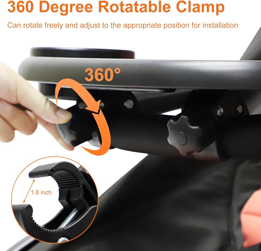 【Double Clip Design】: The clamp of this stroller tray allows for 360 degree rotation, making it easy to adjust the installation angle. In addition, the clamp diameter can be adjusted to a maximum of 1.8 inches. Our clip is suitable for most stroller handlebars on the market.