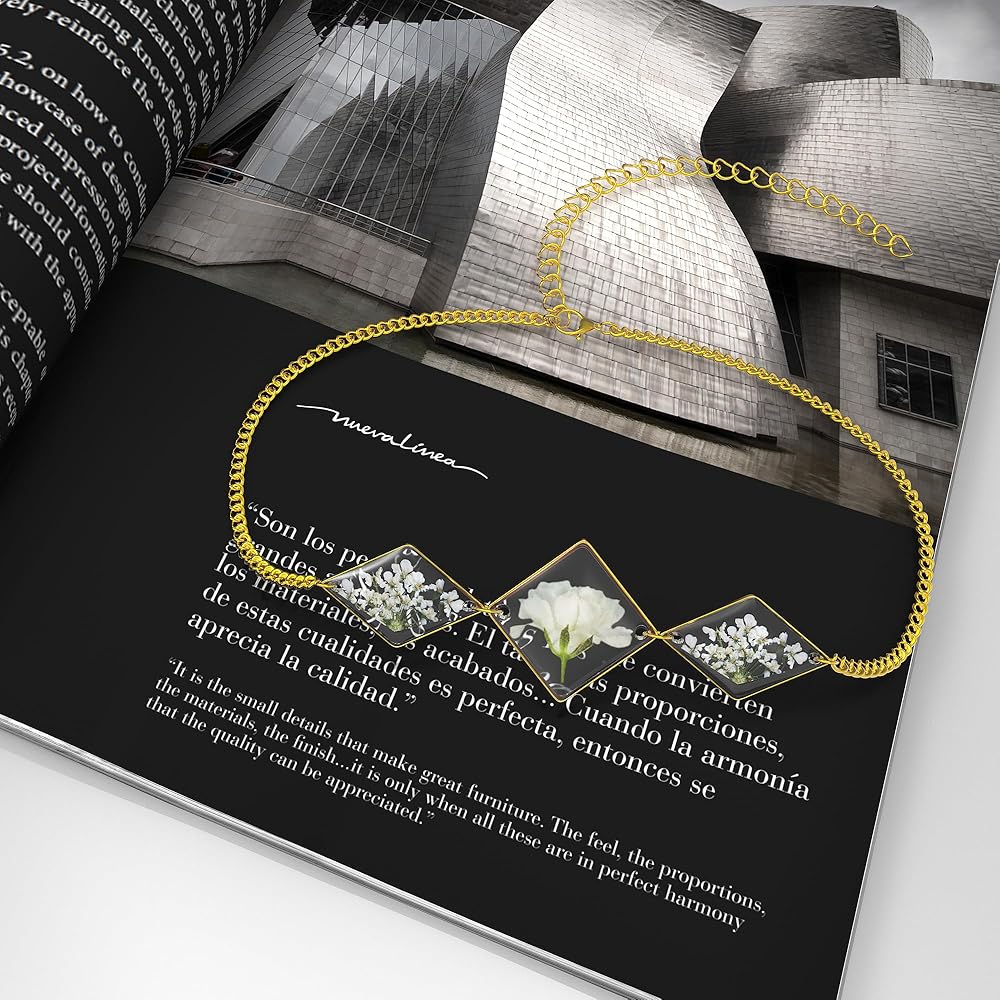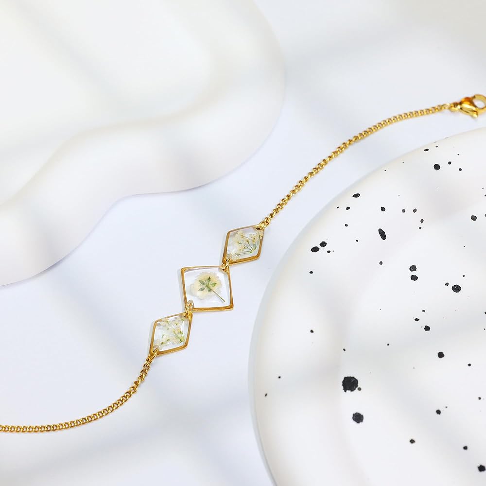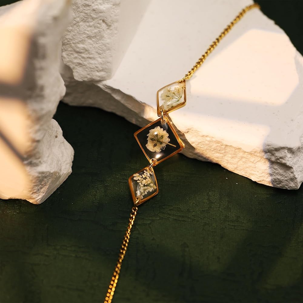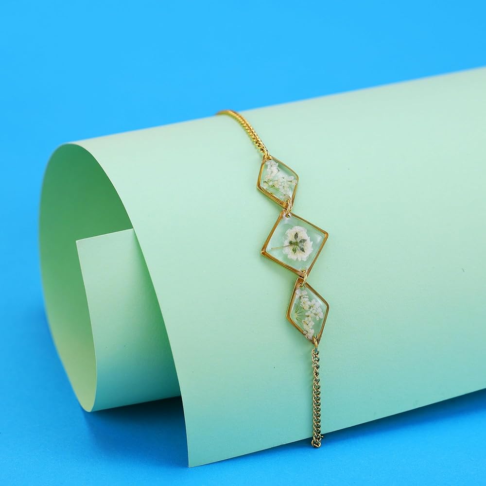سوار زهرة مضغوطة على شكل زهرة أنفاس الطفل وسوار الملكة آن من الدانتيل المضغوط على شكل زهرة برية سوار مصنوع يدويًا سوار من الراتنج على شكل زهرة برية مضغوطة ذهبي سوار زهرة قابل للتعديل