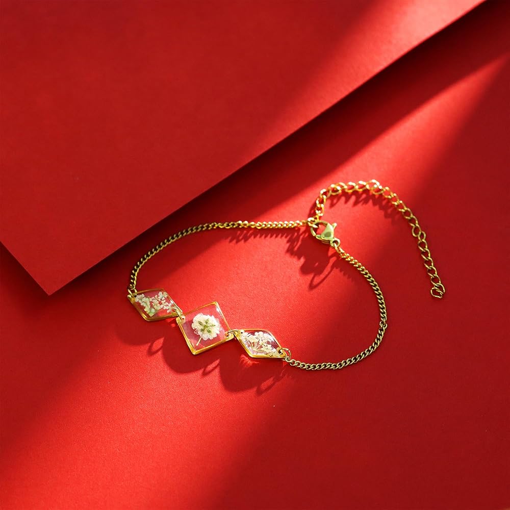Each handmade chain bracelet piece is packed with a in a jewelry box ready for gifting. The gift for any occasion. Please note: since we use natural flowers, there will be slight variations in color shades in the actual product that you receive.