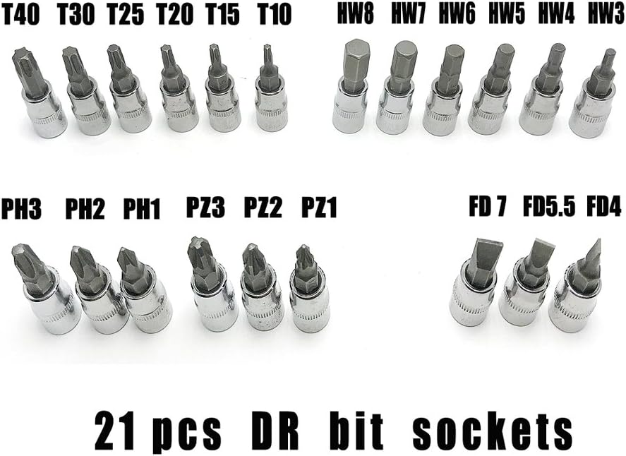 21 قطعة مقابس بت: SL4,5.5,7 PH1,2,3 PZ1,2,3 HEX3,4,5,6,7,8, T10,15,20,25,30,40