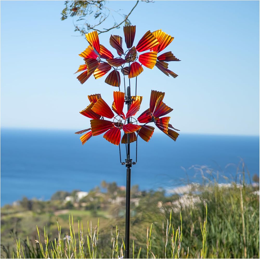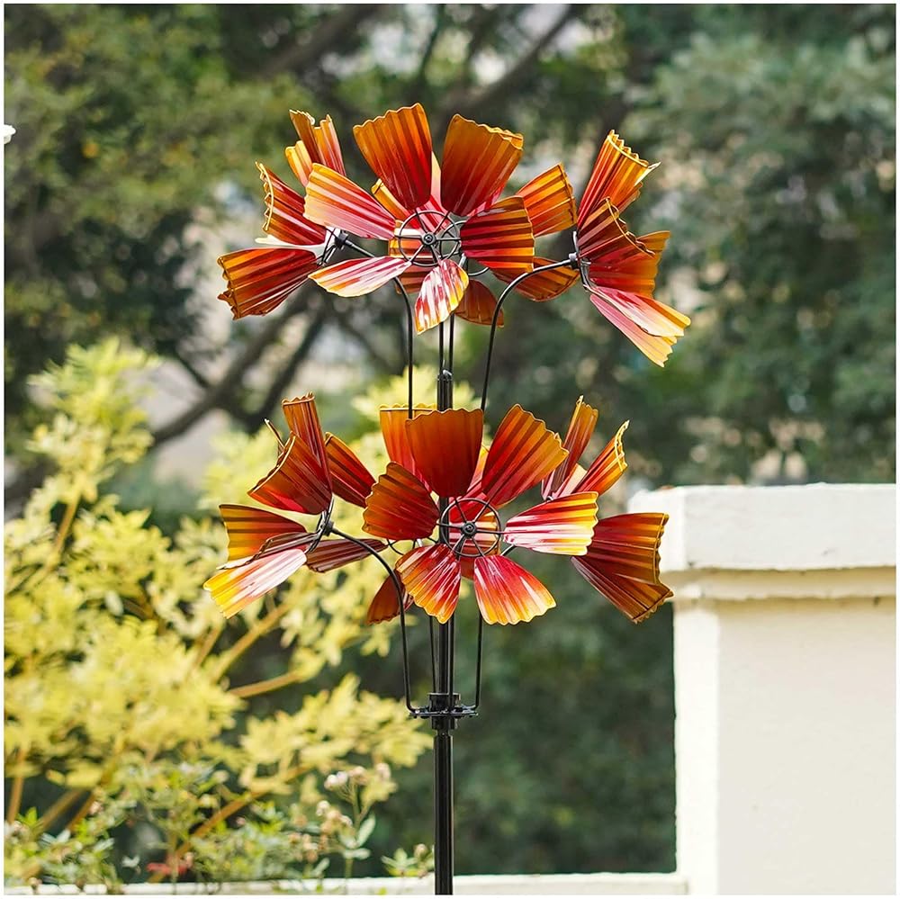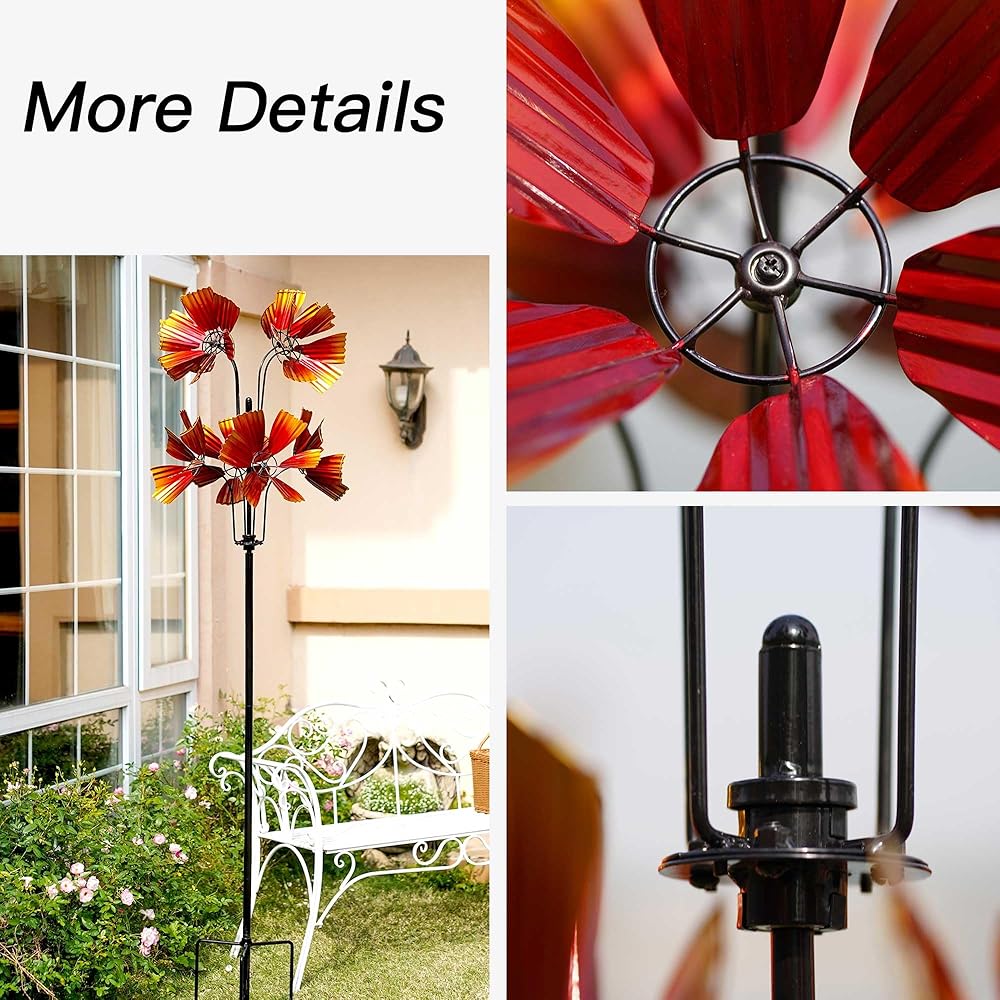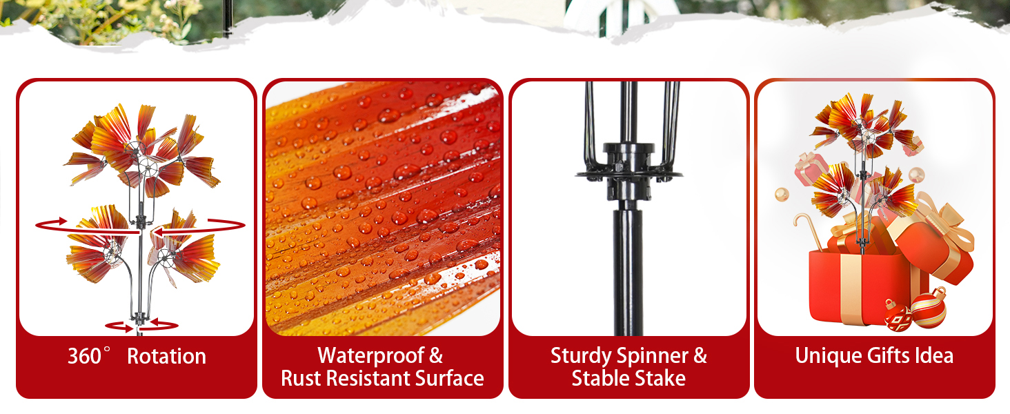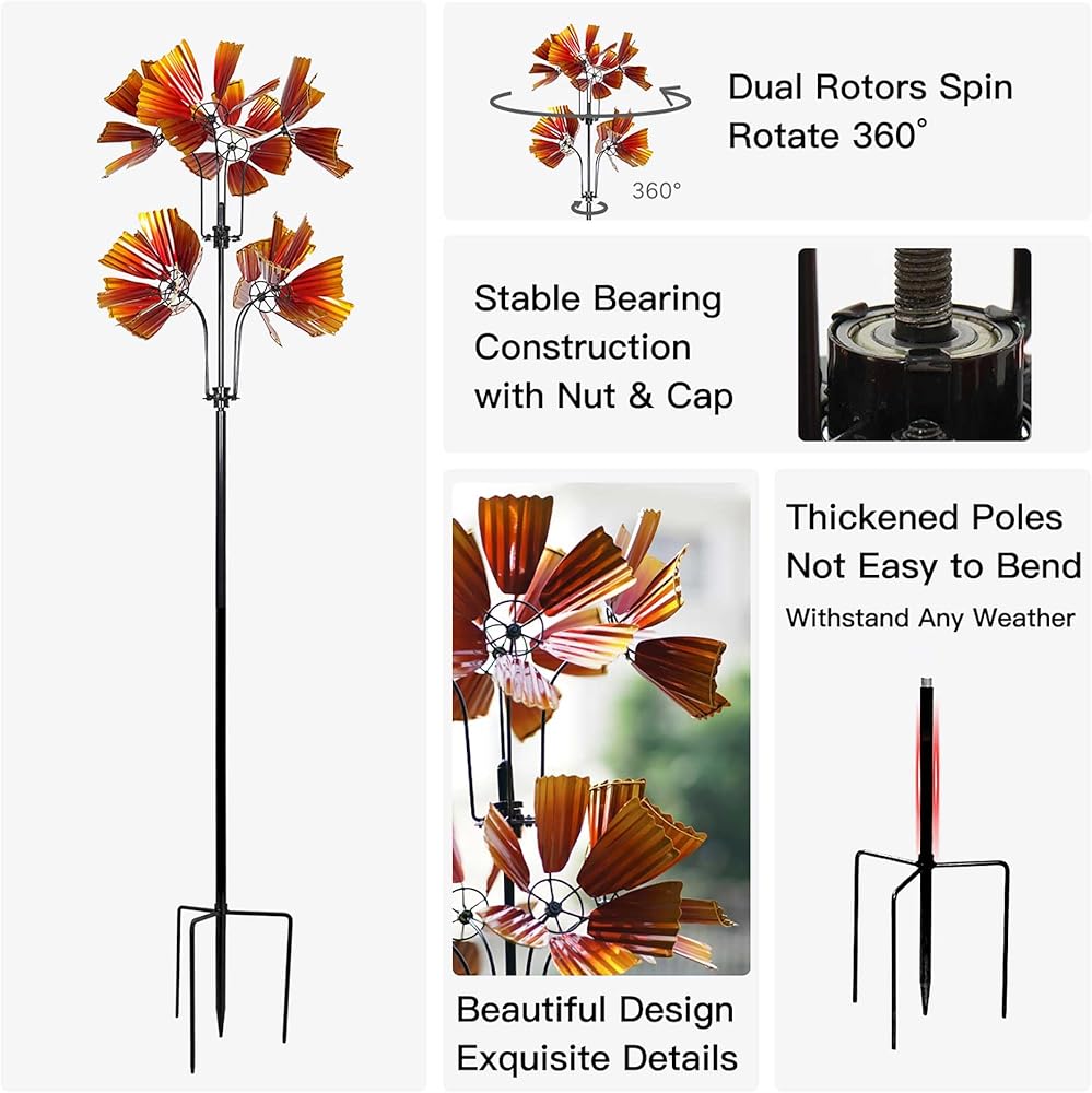 🍂 تصميم أوراق جميل: يتميز هذا الدوار المعدني المذهل بمزيج من اللون الأحمر مع اللون الأصفر. تدور الدوارات المزدوجة بشكل مستقل وتدور 360 درجة. تتميز دوارات الرياح الحركية بأعمدة سميكة (قطر 22 مم) ووتد معدني ثابت بثلاثة شوكات لضمان زراعتها بقوة في الأيام العاصفة وفي مواجهة المناظر الطبيعية الثلجية.