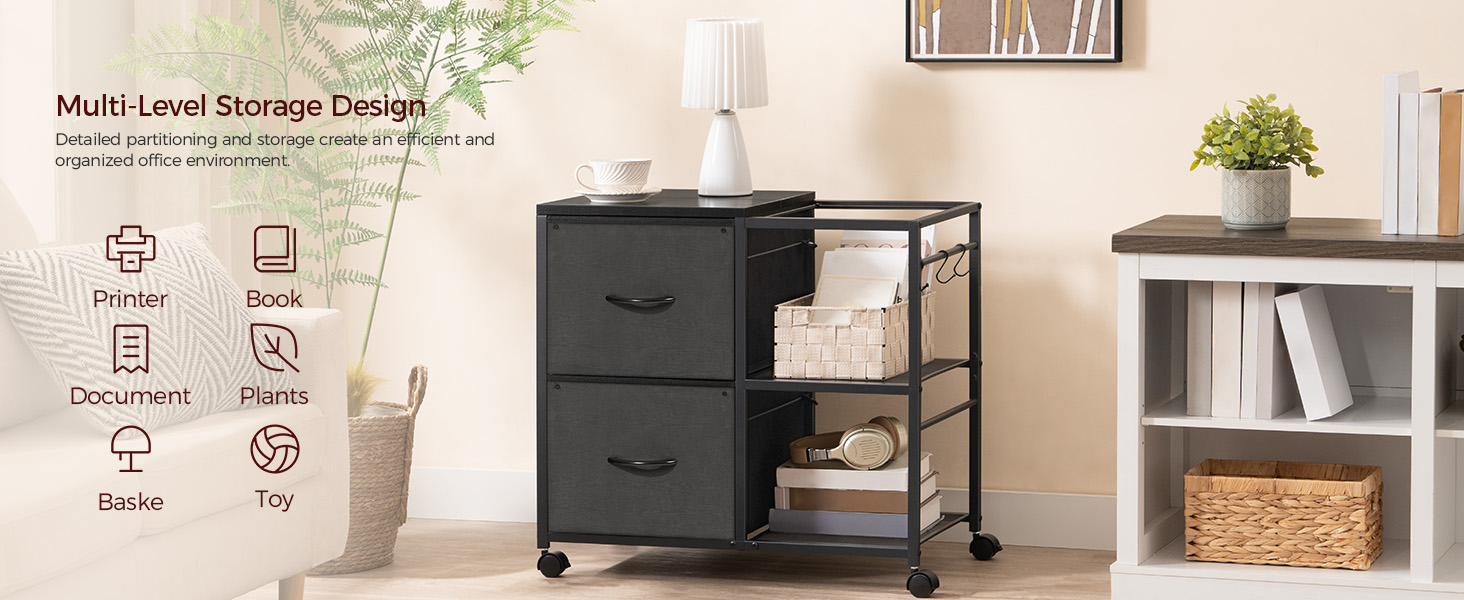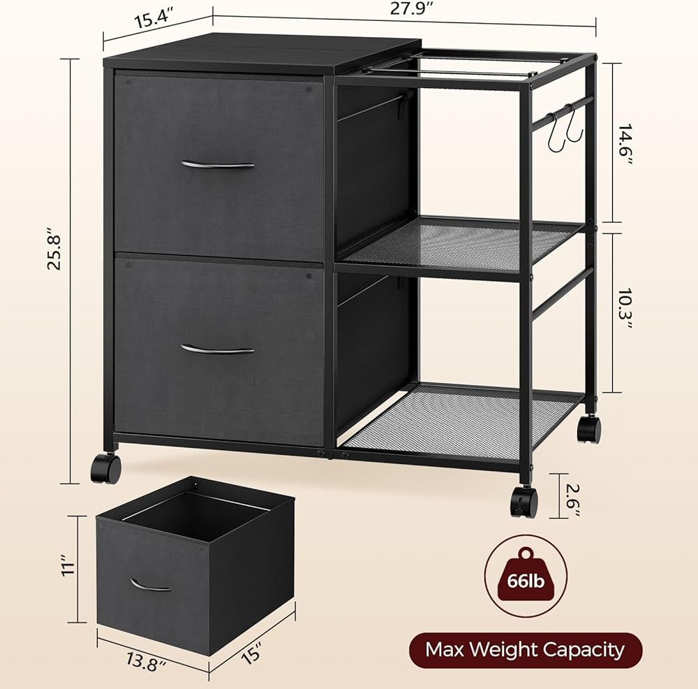 خزانة ملفات متعددة الوظائف: يعمل الحامل المحمول كخزانة للملفات، ويمكن أيضًا استخدامه كحامل للطباعة، وخزانة تخزين لغرفة المعيشة، والمزيد. يبلغ قياسها 27.9 بوصة طولًا × 15.4 بوصة عرضًا × 25.8 بوصة ارتفاعًا، وهي تناسب تمامًا المكاتب وغرف المعيشة والدراسة وما إلى ذلك، مما يعزز نمط حياة منظم جيدًا ومساحة صغيرة