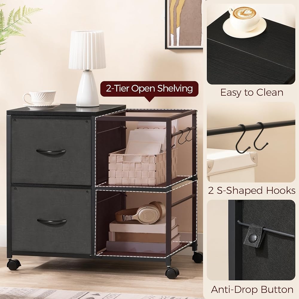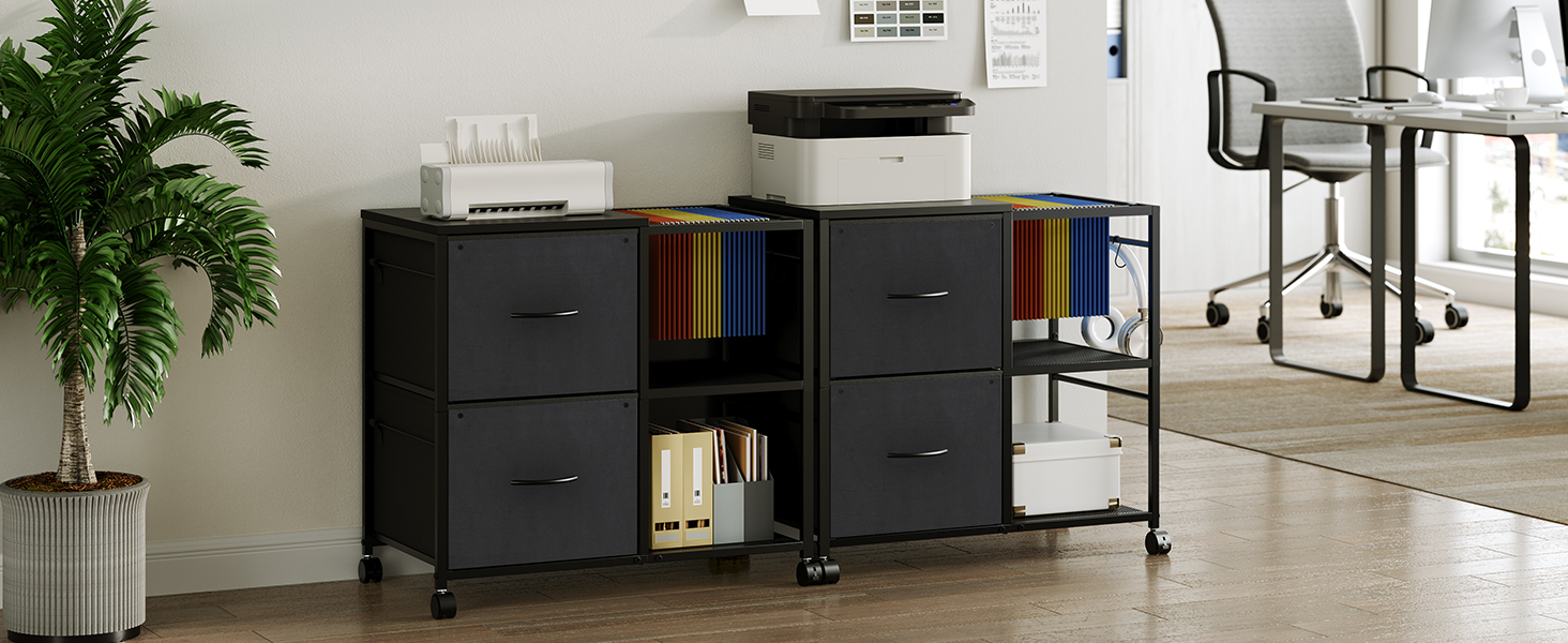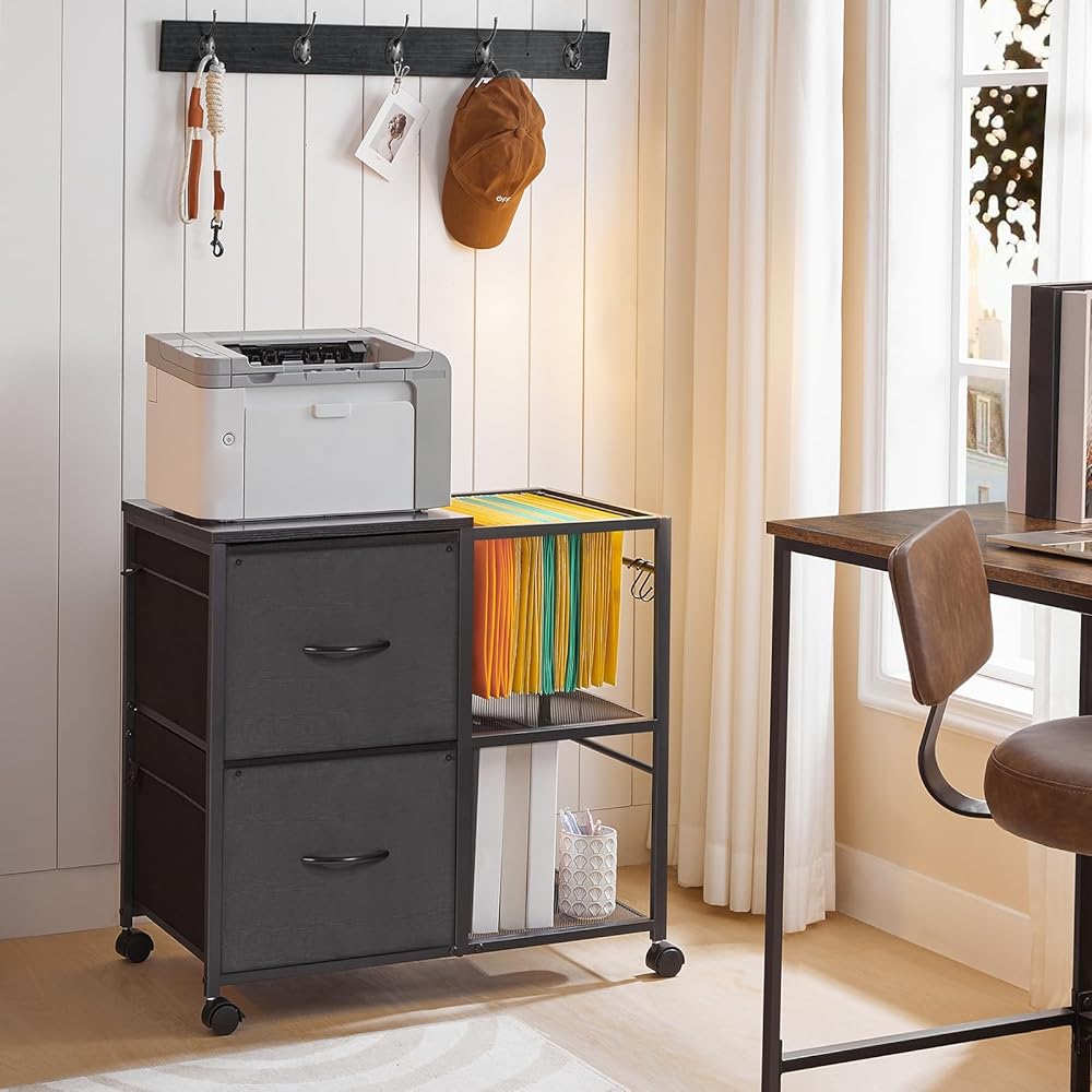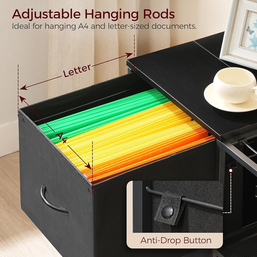 سعة واسعة: تحتوي خزانة الملفات المكتبية على درجين من القماش وقضبان تعليق قابلة للتعديل للمستندات بحجم A4 والرسائل. يساعد الرفان المفتوحان والخطافان على تنظيم الطابعات وصناديق الأدوات والمفاتيح وسماعات الرأس وما إلى ذلك، مما يحافظ على مساحة العمل الخاصة بك مرتبة بسهولة