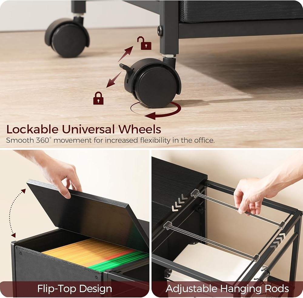 الراحة والتنقل: تتميز خزانة الملفات الخاصة بالمكتب المنزلي بغطاء علوي قلاب لسهولة الوصول إلى العناصر الموجودة في الدرج. مع 4 عجلات صناعية عالمية (2 قابلة للقفل)، فهي توفر المرونة للاستخدام الثابت والمتحرك، مما يخلق بيئة عمل مرنة بسهولة
