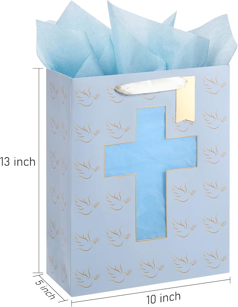 Celebrate your baby boy's special religious occasions with our exquisite Baptism, Christening, First Communion Gift Bag by Sawnfay. This gift bag is designed with a cross-cut window, adding a touch of elegance and style that befits the significance of these momentous events. It comes with two high-quality tissue papers and a gift tag, providing you with everything you need to make your gift presentation stand out. Made from premium materials, our gift bag is durable, long-lasting, and can withstand daily wear and tear. It measures 10inch5inch13inch, providing ample space to hold a variety of gifts. It's the perfect choice for baby boys, baptism gifts for boys, and will surely be a keepsake your loved ones will cherish for years to come. Sawnfay - where elegance and quality come together to create unforgettable memories."