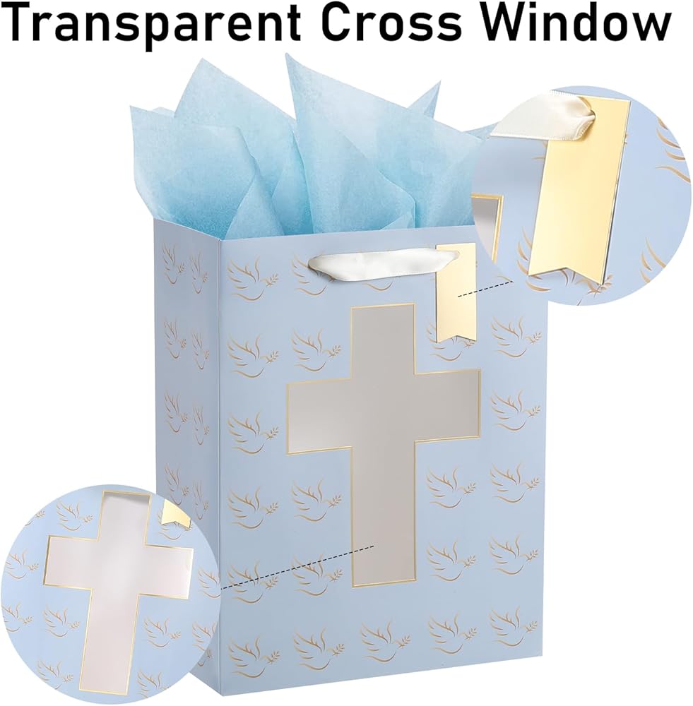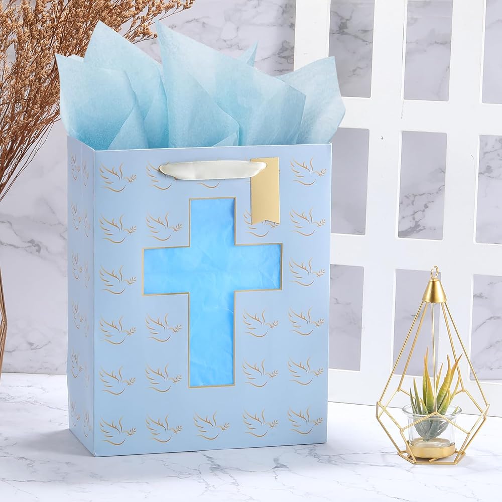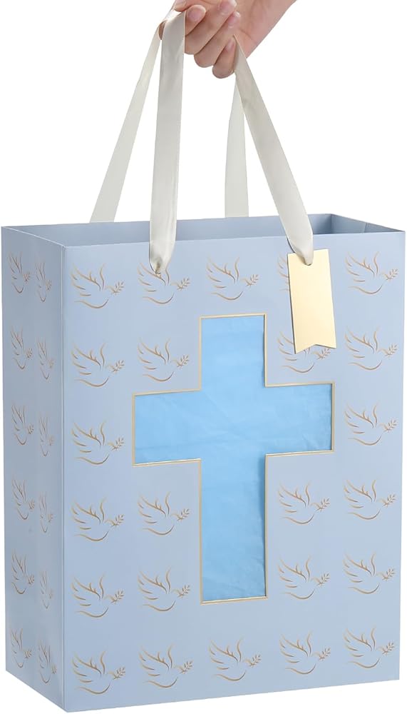 • Religious Design: The blue gift bag features a unique Cross Cut Window Design, with a pattern of pigeons.