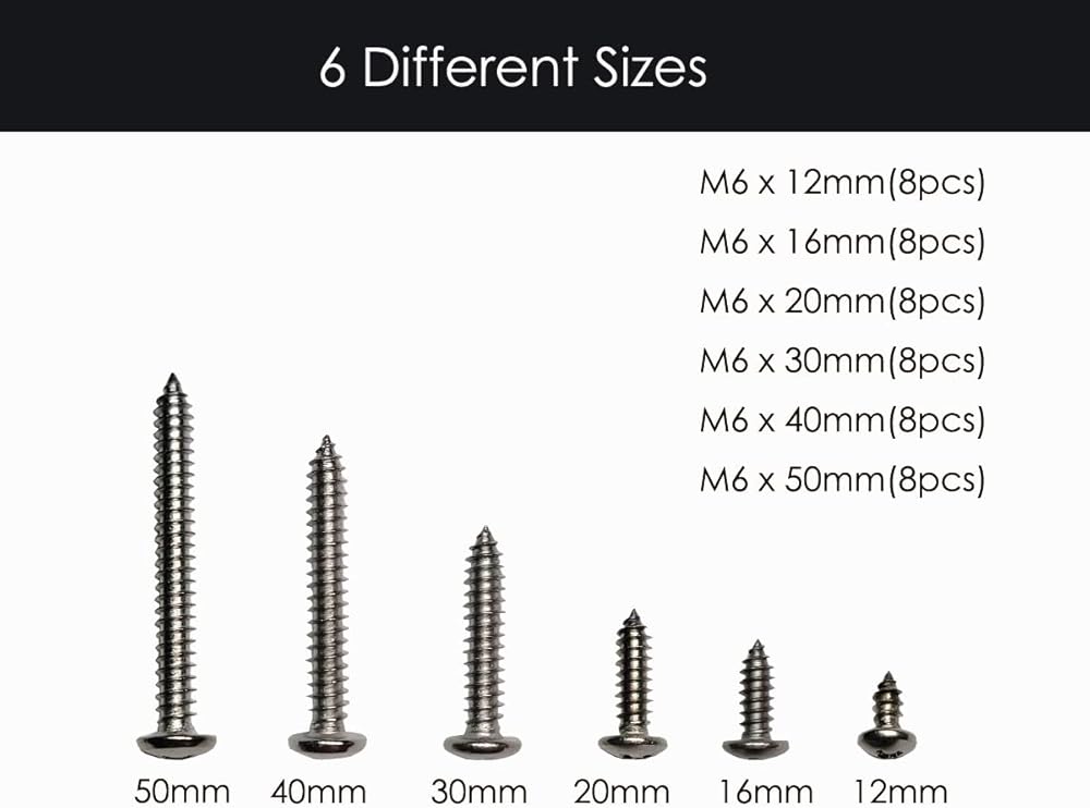 WHAT YOU WILL GET: Our pan heap wood screws kit include M5x10mm/16mm/20mm/30mm/40mm/50mm 6 different sizes metal screws .Totally 48 pieces.