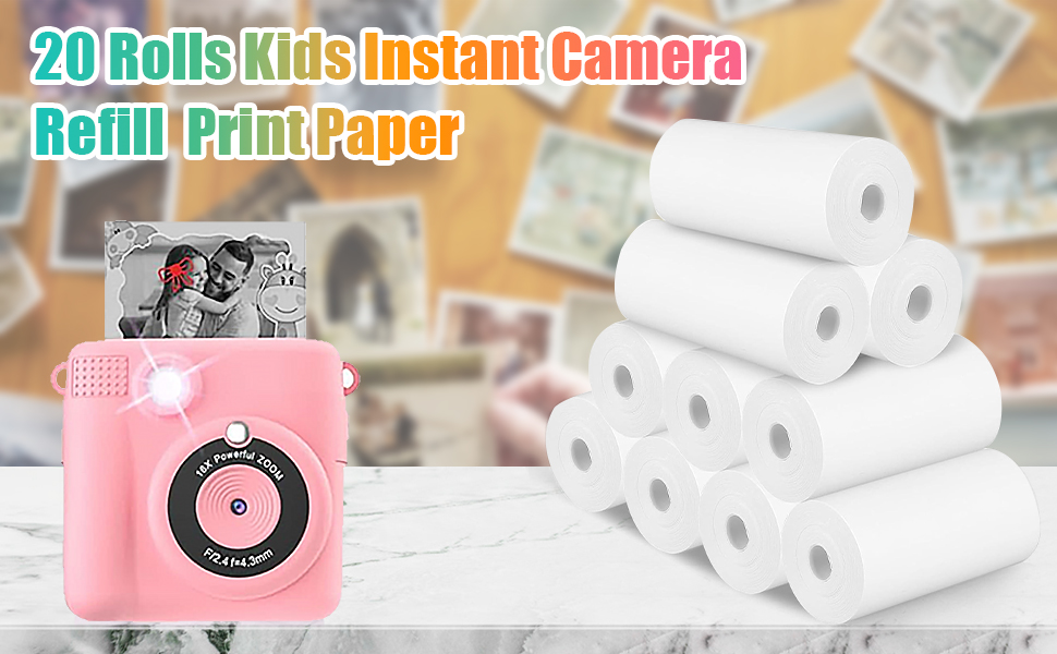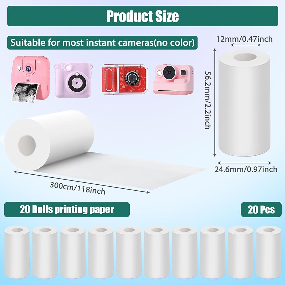 تشمل العبوة: سوف تحصل على 20 بكرة من الورق الحراري الأبيض لإعادة تعبئة الكاميرا الفورية للأطفال. حجم كل لفة 57 مم × 30 مم.