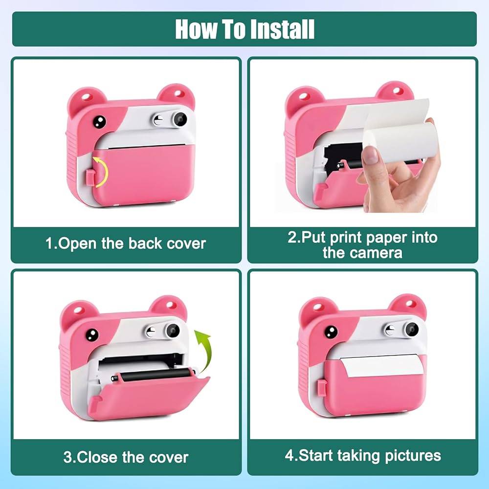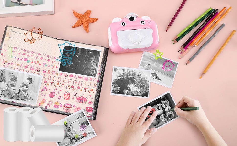 سهلة التركيب: يمكن للأطفال استبدال إعادة تعبئة ورق الكاميرا بأنفسهم بسهولة، فقط انتبه إلى الاتجاه عند التثبيت. كما أن ورق الطباعة صغير ومحمول، مما يجعل من السهل اصطحابه معك عند السفر لتسجيل كل لحظة.