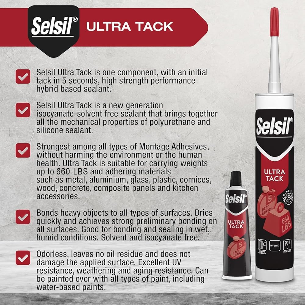 مادة لاصقة متعددة الاستخدامات: Selsil Ultra Tack هو جيل جديد من مادة مانعة للتسرب خالية من المذيبات من الأيزوسيانات تجمع بين الخصائص الميكانيكية لموانع التسرب المصنوعة من السيليكون والبولي يوريثين. يمكن استخدام لاصق البناء الخاص بنا كمادة لاصقة مرنة في الداخل والخارج.