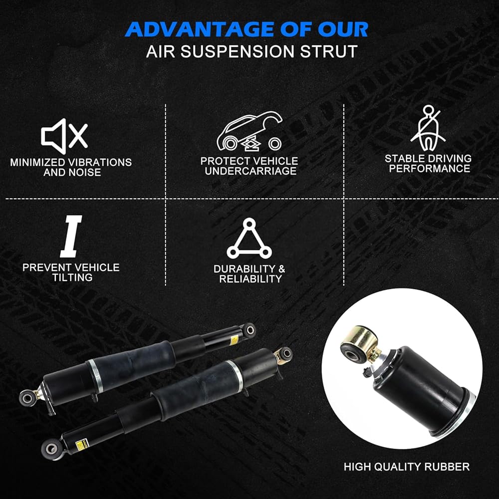 【دعامة تعليق هوائية قابلة للتعديل】: مصنوعة من مواد عالية الجودة وهندسة دقيقة، تتحمل متطلبات ظروف القيادة اليومية المختلفة. يجمع بين وظائف ممتص الصدمات والزنبرك الهوائي لتوفير أقصى درجات الراحة على الطريق. إنه يدعم وزن سيارتك بشكل فعال، ويمتص اهتزازات الطريق، ويوفر ارتفاعًا مناسبًا للركوب قابل للتعديل.